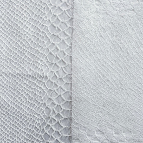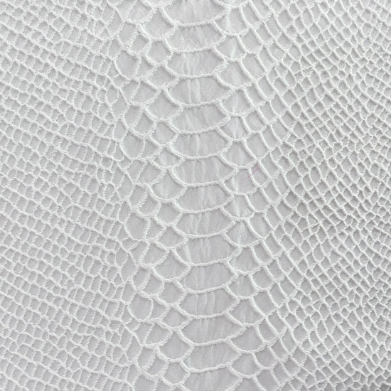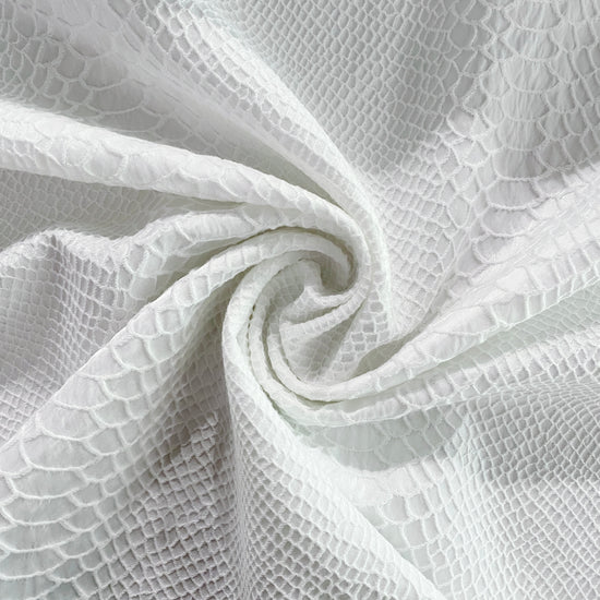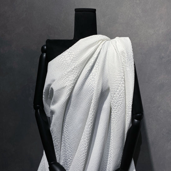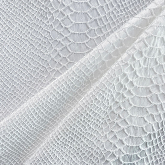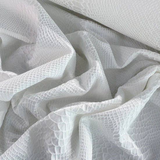 Cotton-blend satin jacquard in White. This light-medium weight fabric has been tightly woven in a satin jacquard structure with a reptile motif, featuring a lustrous sheen with a tactile handle. It has a soft drape, opaque coverage, and some stretch across the weft.