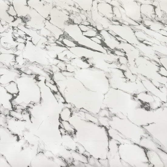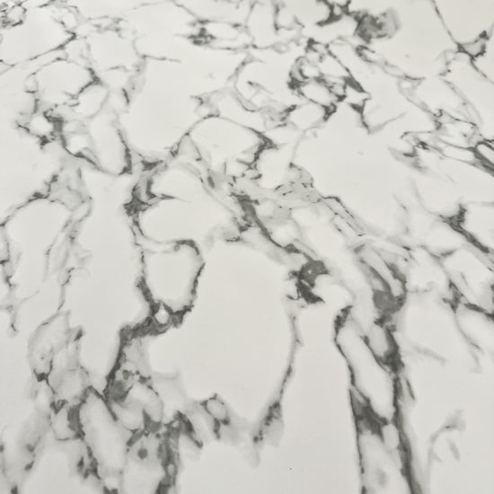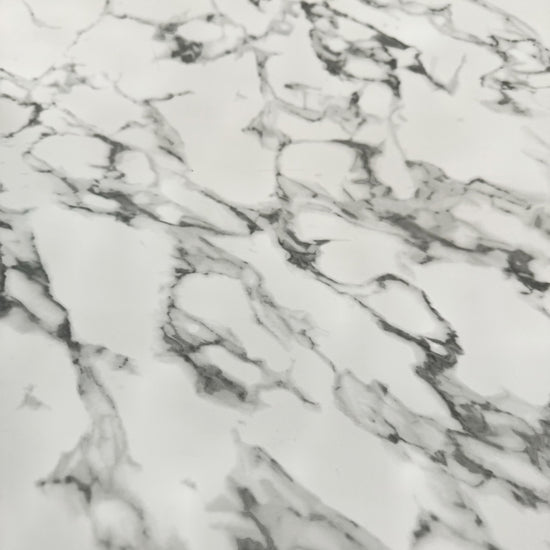 Marble PVC in White/Smoke Grey. This heavy weight PVC has a printed marble motif, with a smooth handle. Bonded to a backing, it has a stiff drape, opaque coverage, and no stretch.