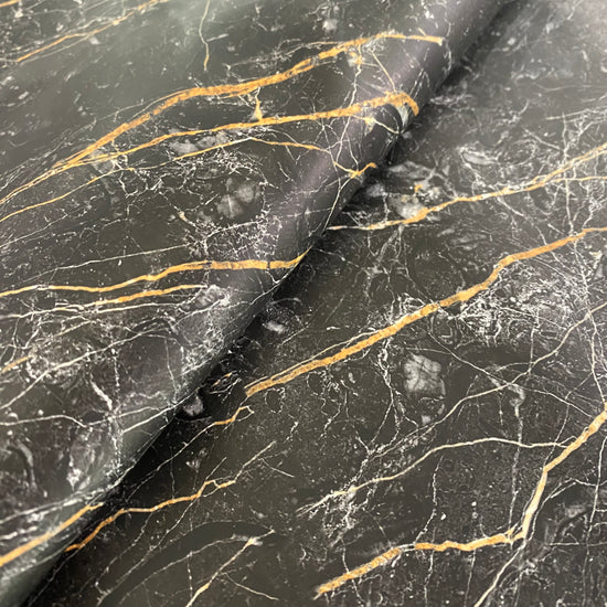 Marble PVC in Dark Grey/Gold. This heavy weight PVC has a printed marble motif with gold accents, and a smooth handle. Bonded to a backing, it has a stiff drape, opaque coverage, and no stretch.
