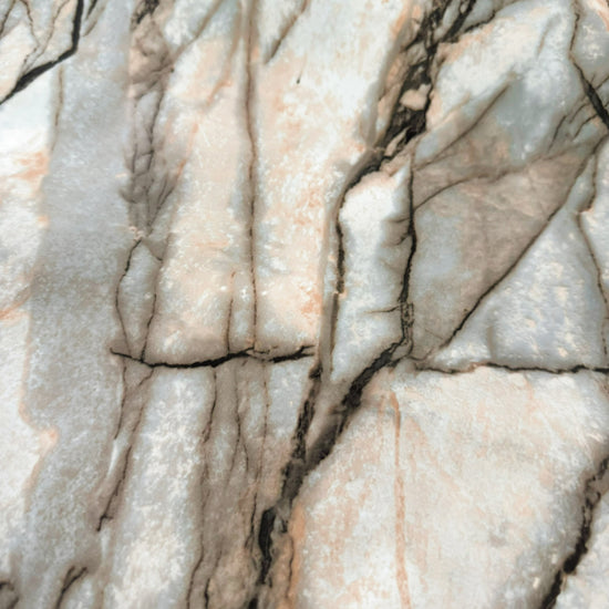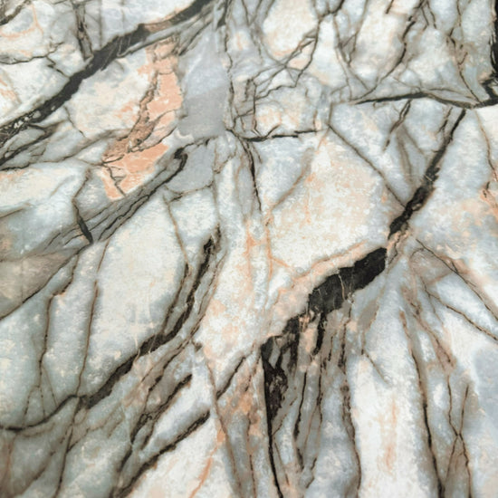 Marble PVC in Gainsboro/Peach Puff/Burnt Umber. This heavy weight PVC has a printed marble motif, with a smooth handle. Bonded to a backing, it has a stiff drape, opaque coverage, and no stretch.