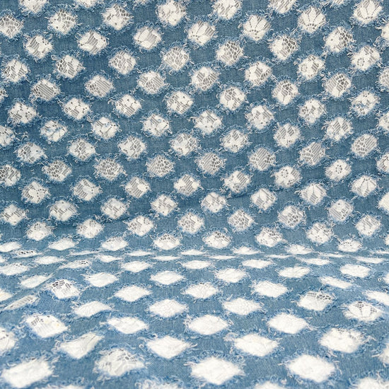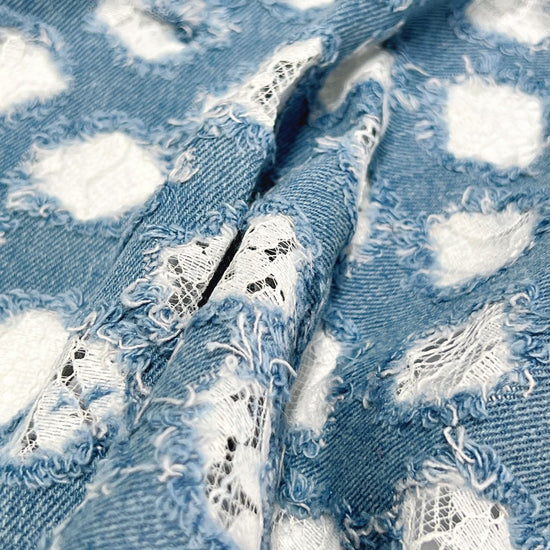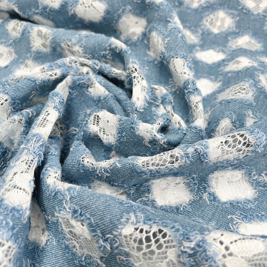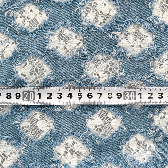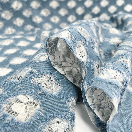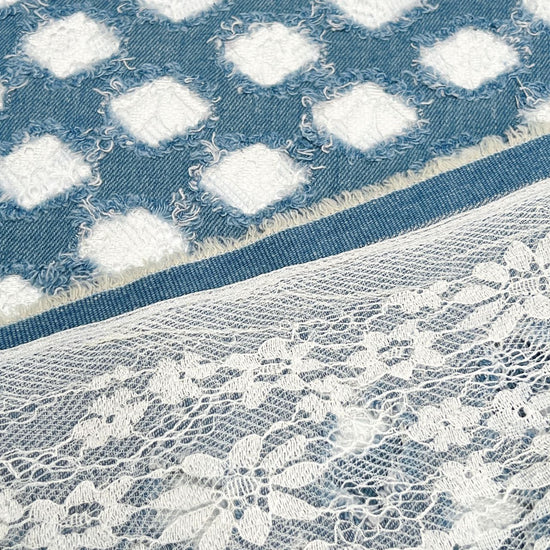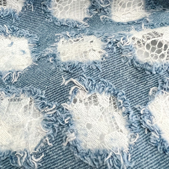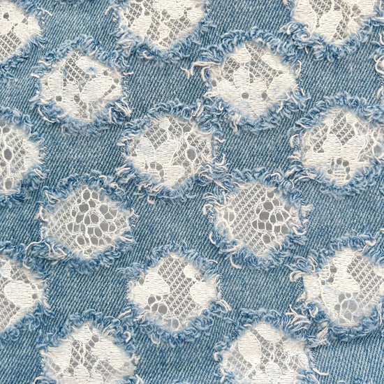 A medium to heavy weight, semi-sheer lace window denim with no give. It has a matte, textured appearance, dry, textured handle and minimal drape.