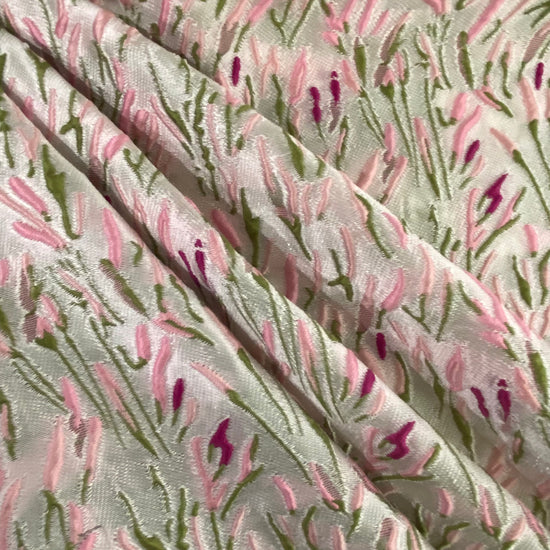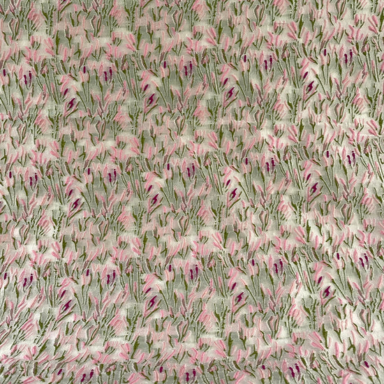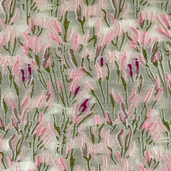 A medium weight, opaque, raised motif jacquard with structured drape, soft, warm, textured handle and slightly shiny appearance.