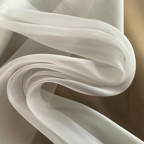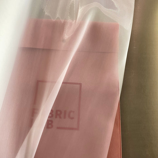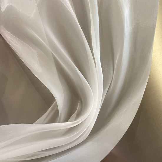 A heavy weight, sheer organdy with no give. It has a lustrous appearance, stiff, sculptural drape and smooth handle.