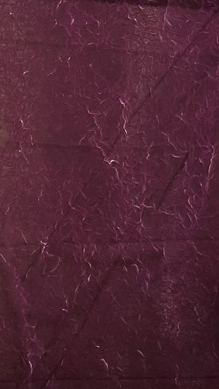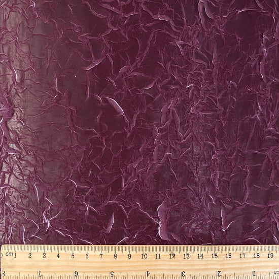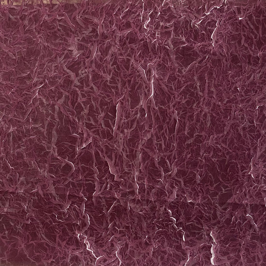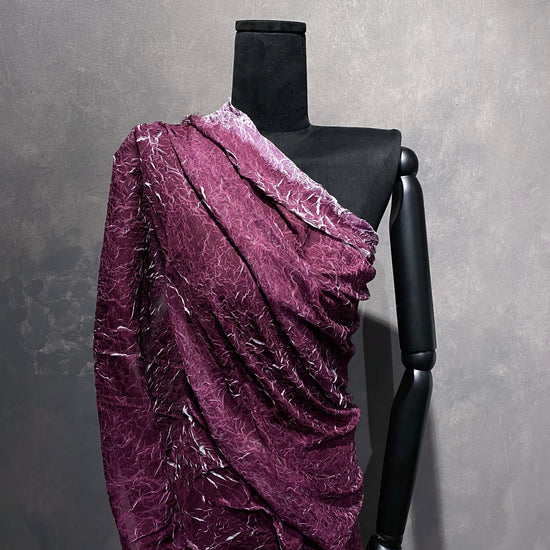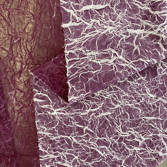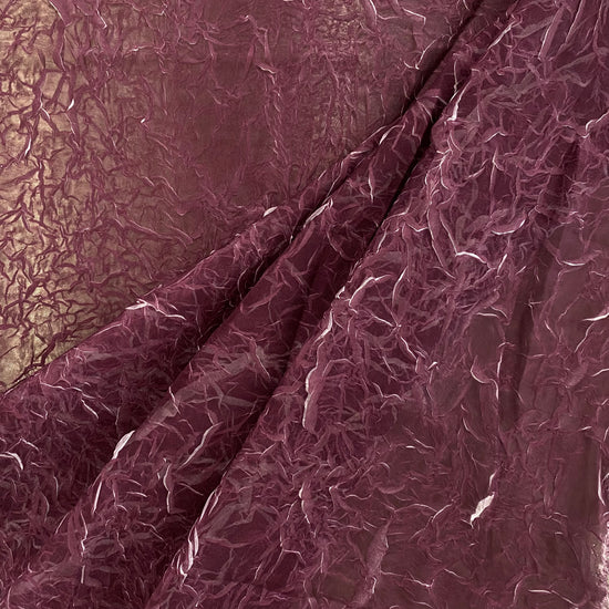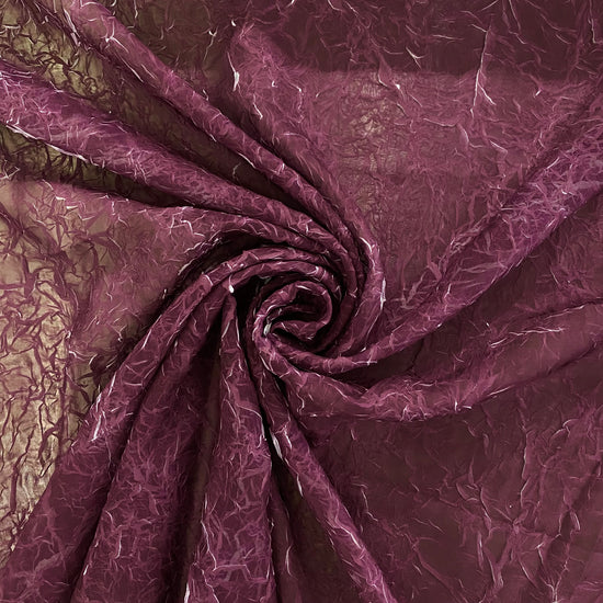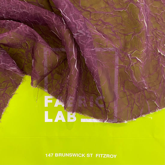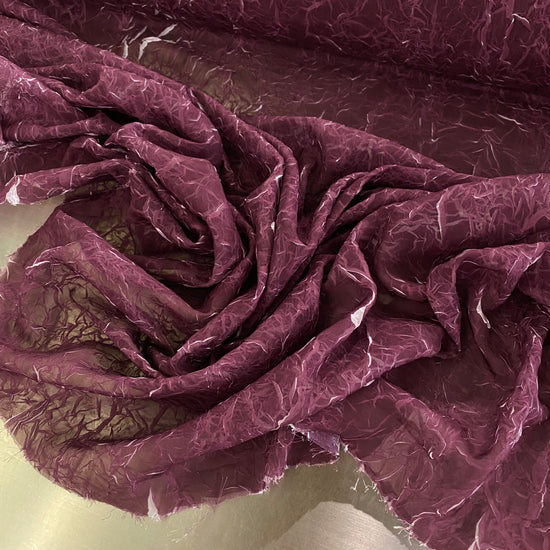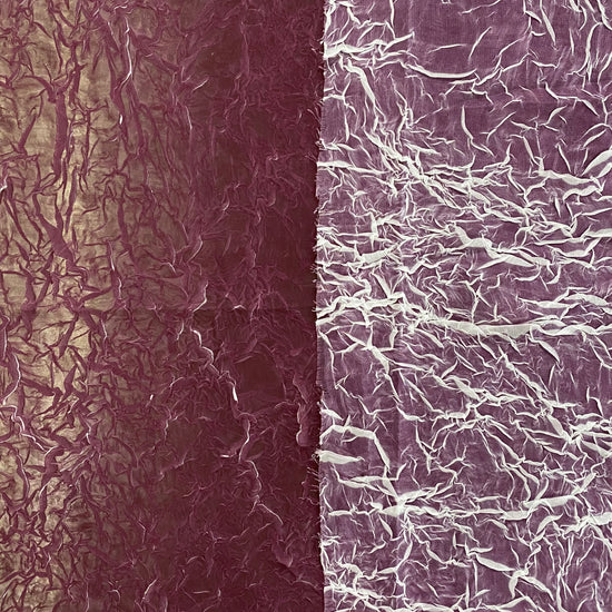 A light weight, sheer, white chiffon with creased plisse texture, printed over with a dark magenta ink, revealing the unmarked white chiffon underneath as the creases open and expand, similar to the "le pliage comme méthode" technique of artist Simon Hantaï. Great drape, crinkly textured handle, a lot of stretch in the weft direction due to the pleating and moderate stretch in warp direction. Use either side of this fabric (or both) as each side has a unique colour and texture.