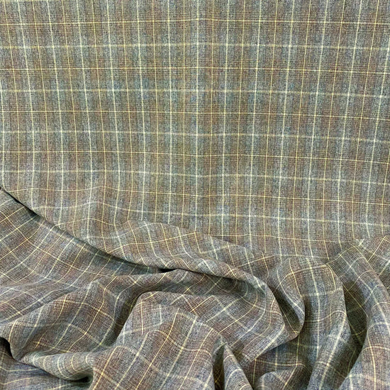 Cotton polyester blend tartan in Grey/Brown/Cream. This medium weight fabric has a fine tattersall tartan weave, featuring fine stitched details, and a smooth handle. It has a fluid drape, opaque coverage, and stretches across the weft and bias.