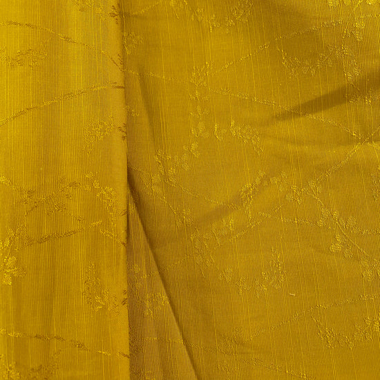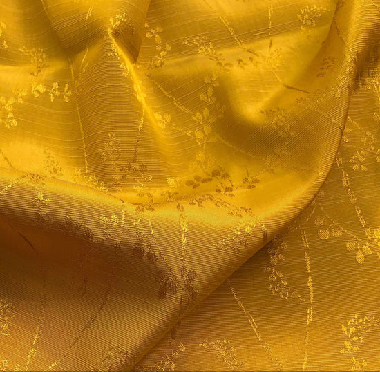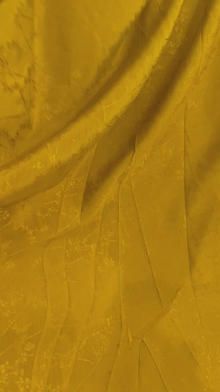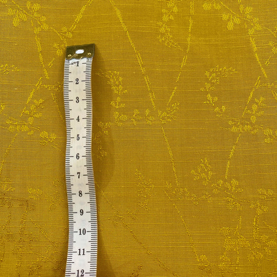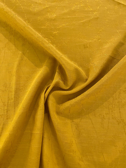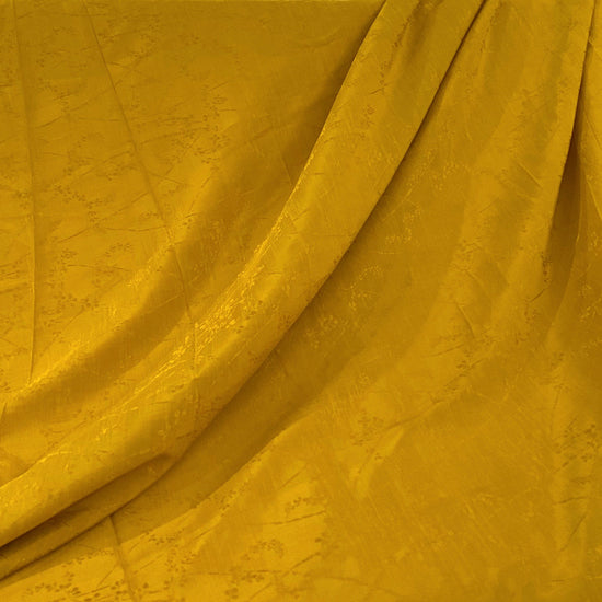 A light weight mustard/gold damask fabric with floral motif. This is opaque fabric with great drape and shiny floral embroidery running from selvage to selvage that adds a slight texture.