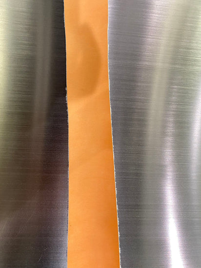 Cotton bonded PU in White/Orange. This heavyweight fabric has a smooth polyurethane surface, bonded to a cotton backing. It features photochromic properties (UV reactive), morphing within an intermediate colour gradient from white to orange. It has a structured drape, opaque coverage, and no stretch.