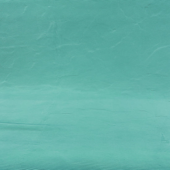 Fairly stiff, but very stretchy, accordion-pleated pale turquoise taffeta. Light to medium weight with a smooth, papery handle. Holds it’s shape well for structural pieces.