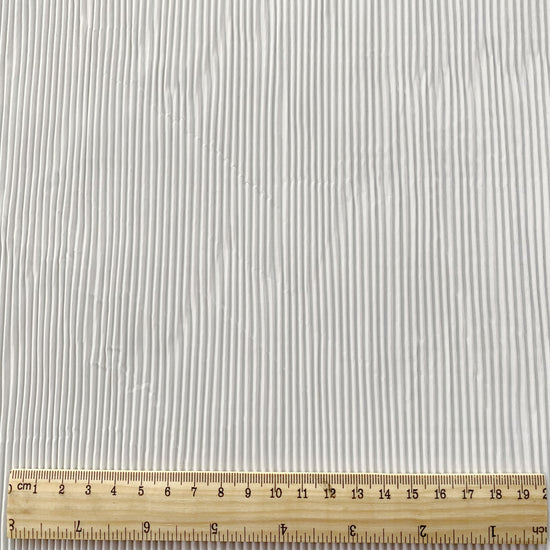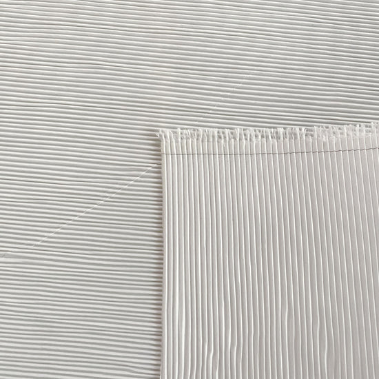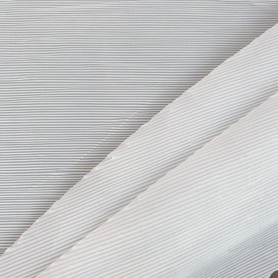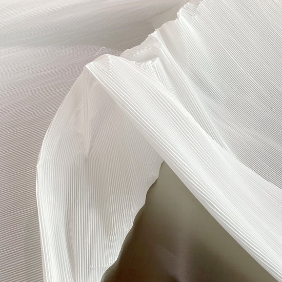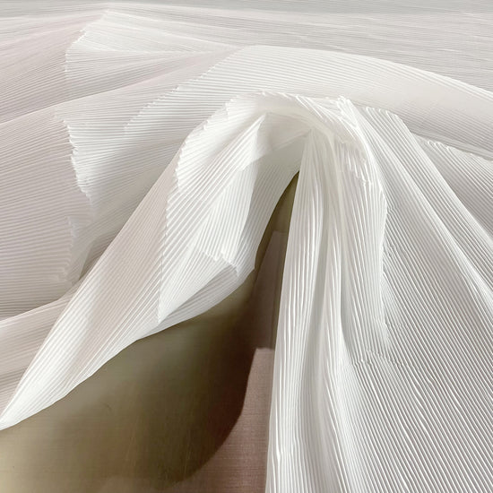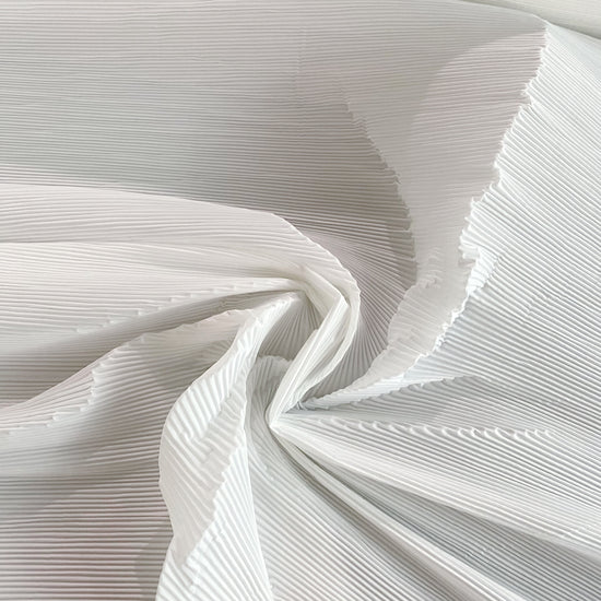 Fairly stiff, but very stretchy, accordion-pleated white taffeta. Light to medium weight with a smooth, papery handle. Holds it’s shape well for structural pieces.