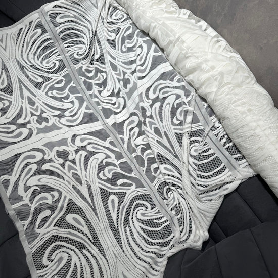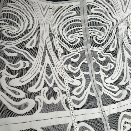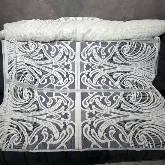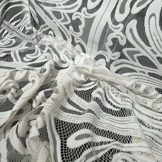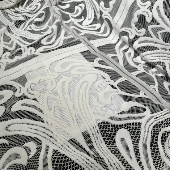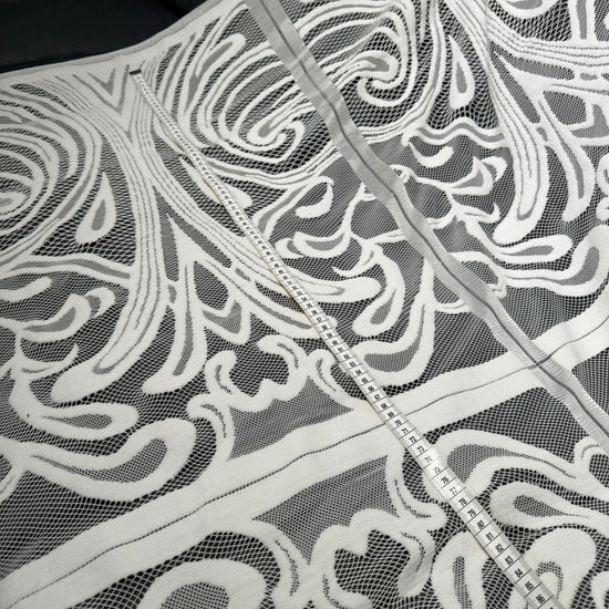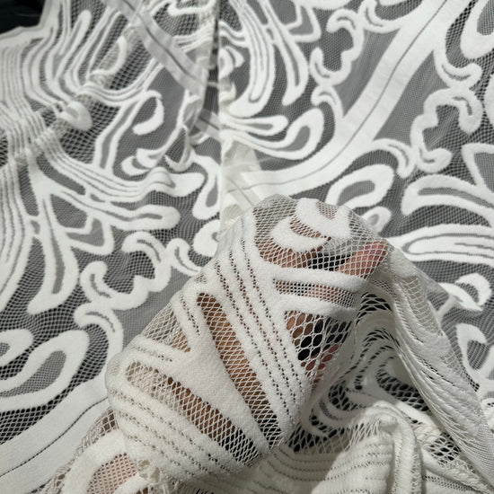 A medium weight, sheer, panelled lace with a net/towelling handle and matte, textured appearance, structured drape and some give in both warp and weft directions.