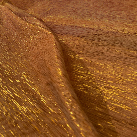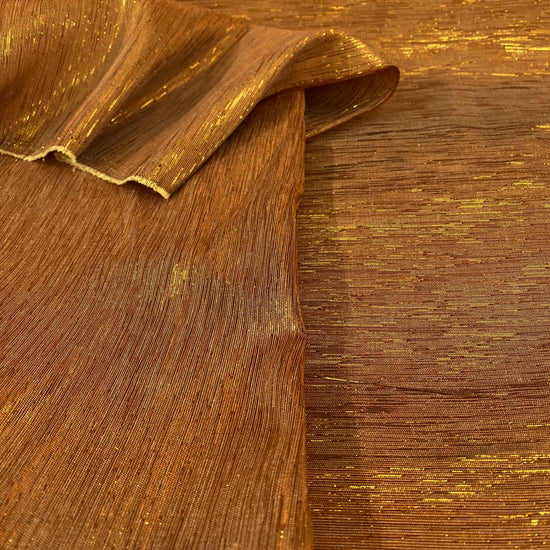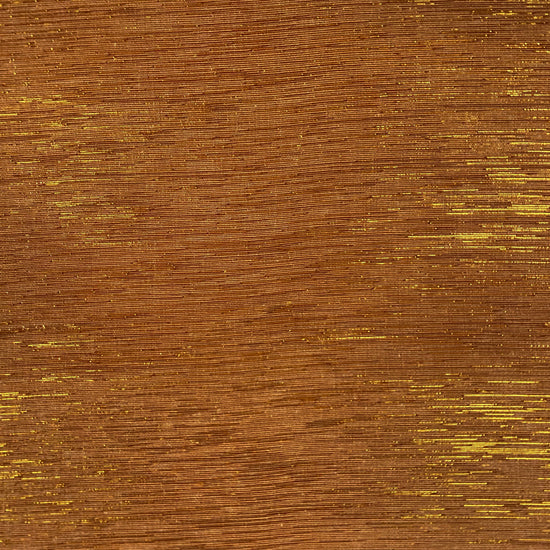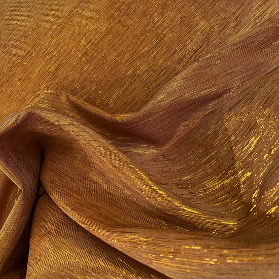 A soft, smooth cotton/polyester with shiny lurex. Golden coloured with shiny copper highlights running from selvage to selvage. A light to medium weight, woven with some drape and an understated sparkly appearance.