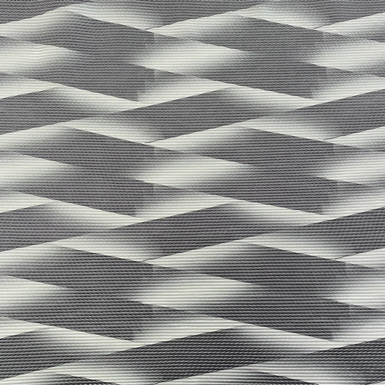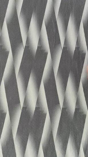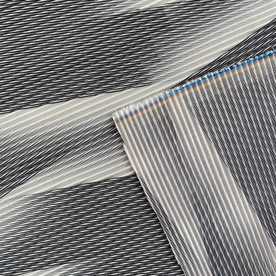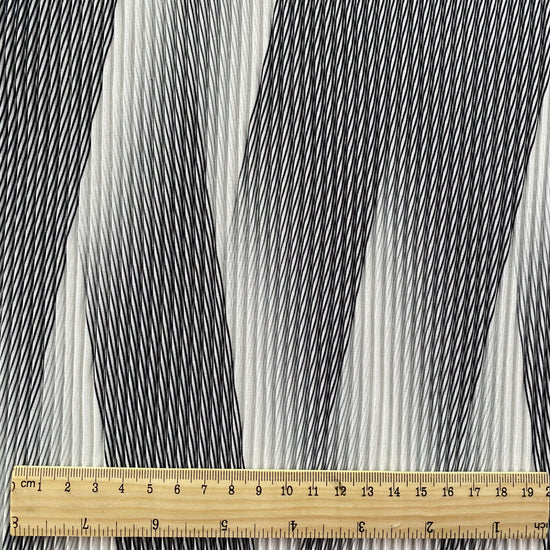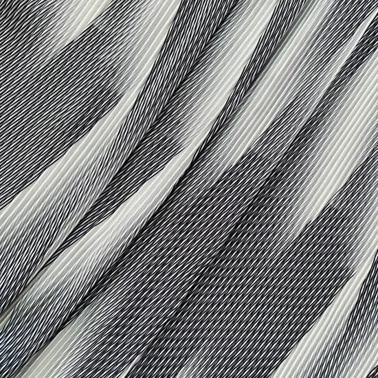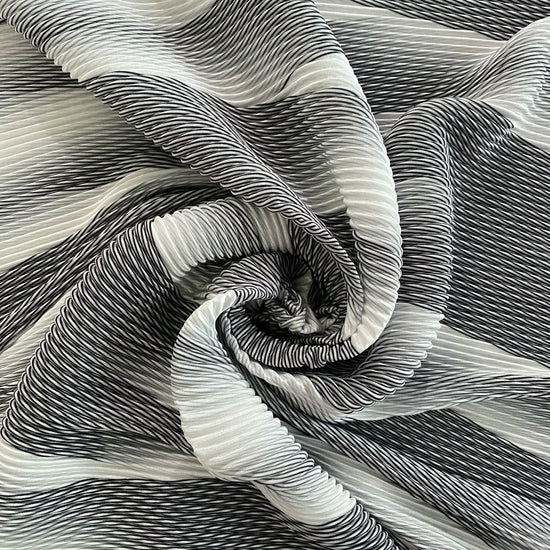 Polyester satin plisse in White/Black. This lightweight fabric has a fine satin weave, a hatched digital print, treated with a fine pleated handle. It has a fluid, bouncy drape, opaque coverage, and elongates across the pleated finish.