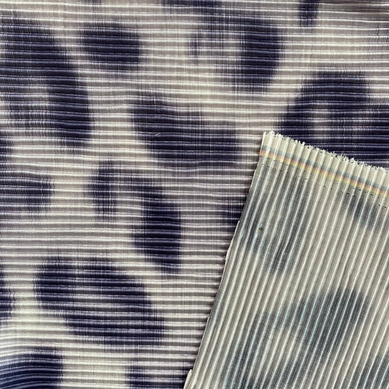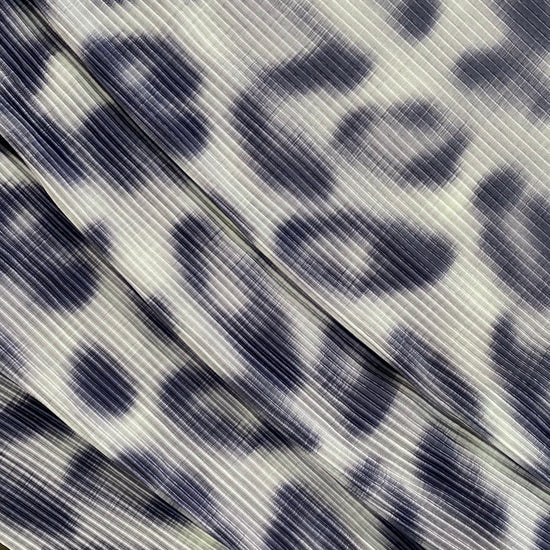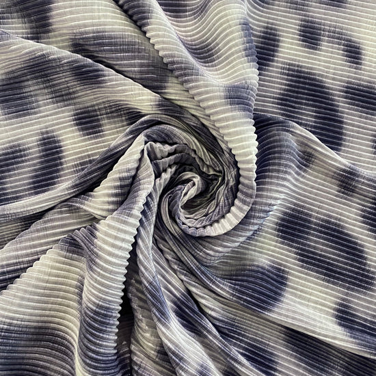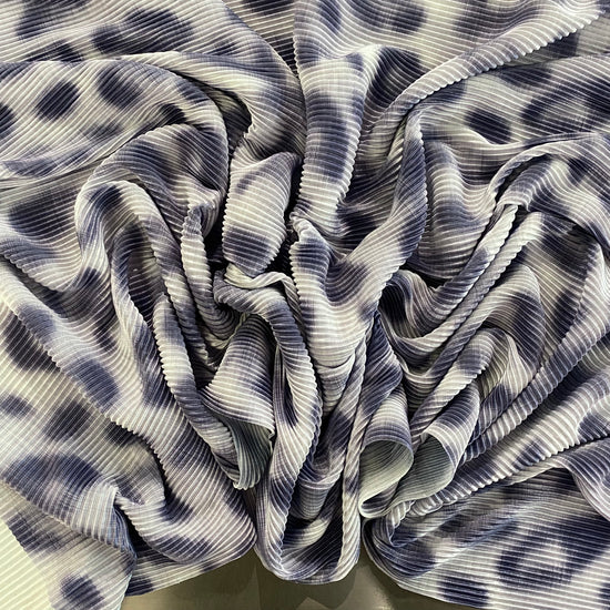 Polyester pleated fabric in Slate Blue/Ghost White. This lightweight fabric has a fine satin weave treated with a fine pleated finish, and a digital printed airbrush motif in an abstract leopard-like pattern. It has a fluid, bouncy drape, delustered look with subtle sheen, opaque coverage, and elongates across the pleated finish.