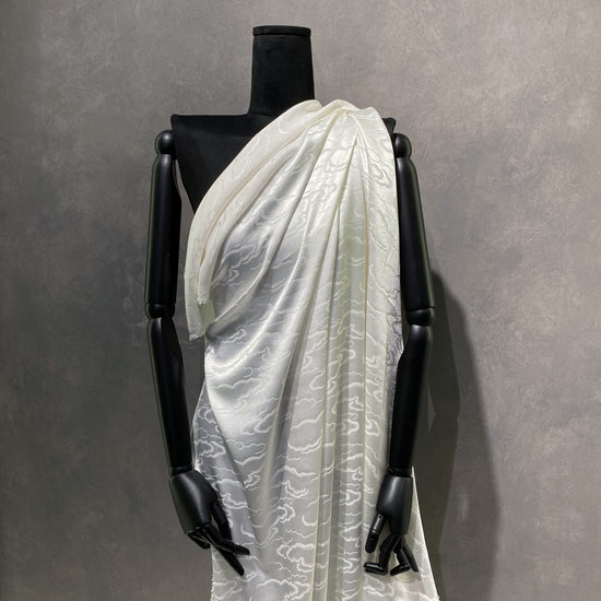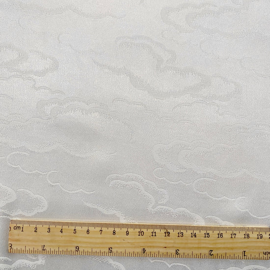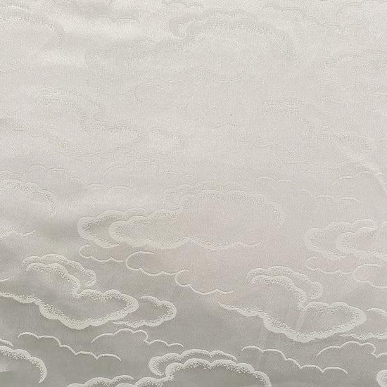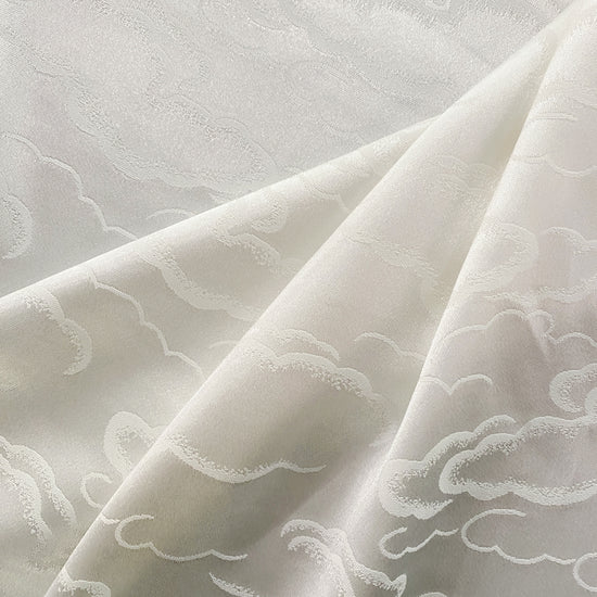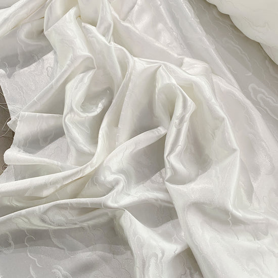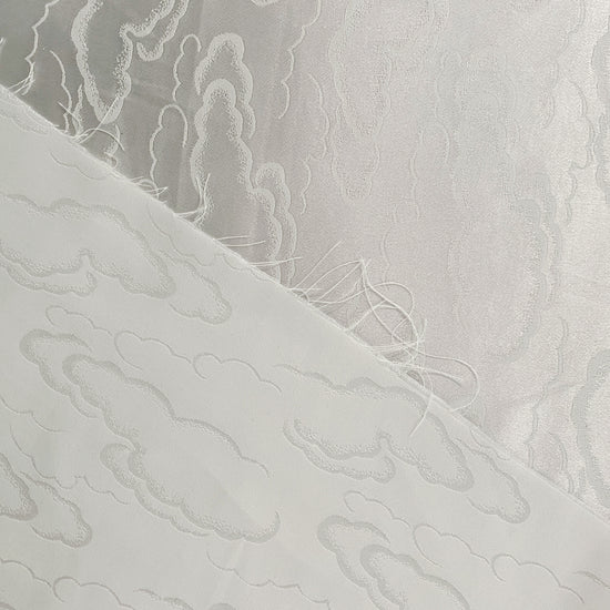 Silk-polyester blend satin jacquard in Snow White. This lightweight fabric has a tight satin jacquard weave with cloud motifs, a lustrous sheen and a smooth handle. It has a fluid drape, opaque coverage, and slight ease (of stretch) across the salvage.
