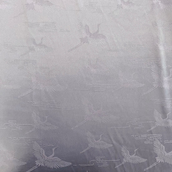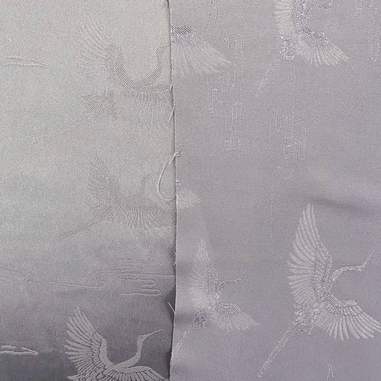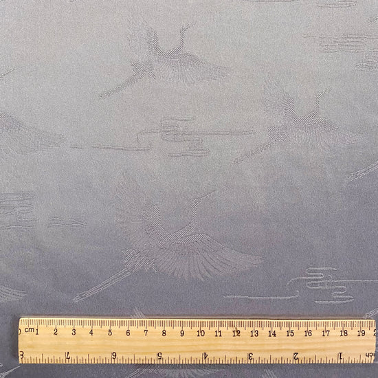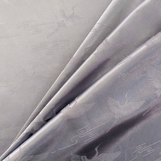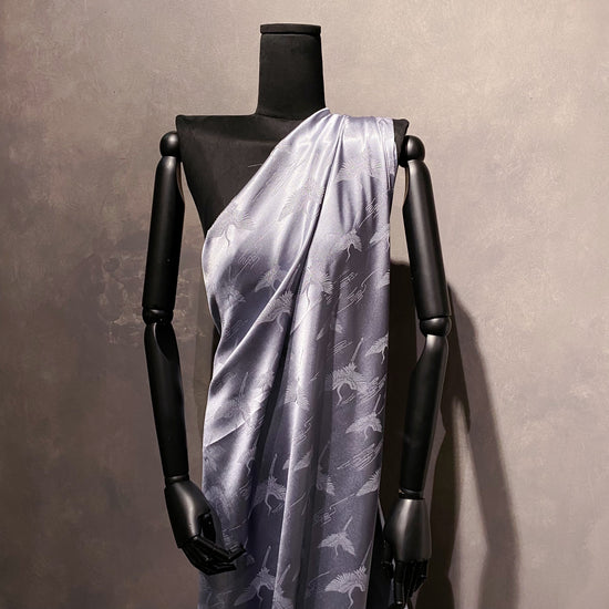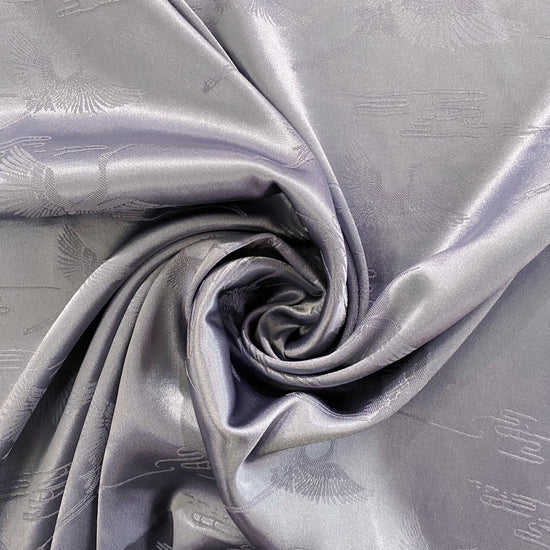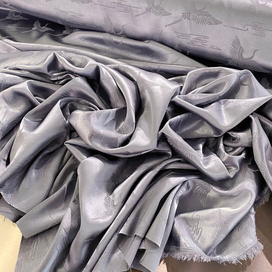 Silk-polyester blend satin jacquard in Slate Grey. This medium-to-lightweight fabric has a fine satin jacquard weave with crane motifs, a lustrous sheen and a smooth handle. It has a fluid drape, opaque coverage, with slight stretch across the selvedge.