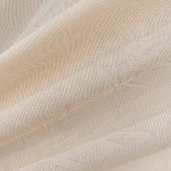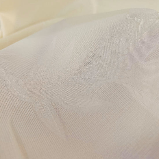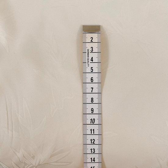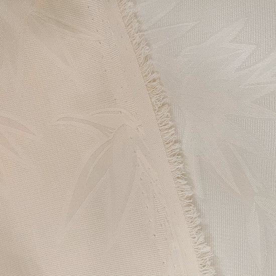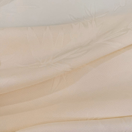 Polyester silk blend jacquard in Butter Yellow. This lightweight fabric has a fine jacquard weave with silk embroidered bamboo motifs, and a subtle satin lustre. It has a fluid drape, opaque coverage, slight give in the weft direction and no give in the warp direction.