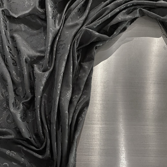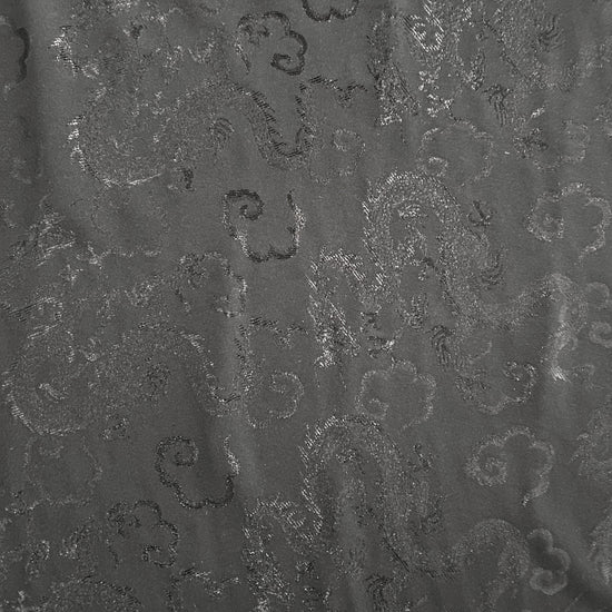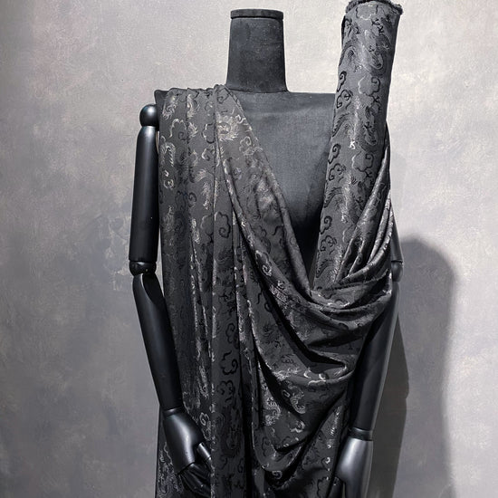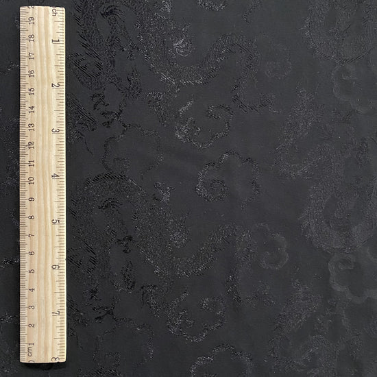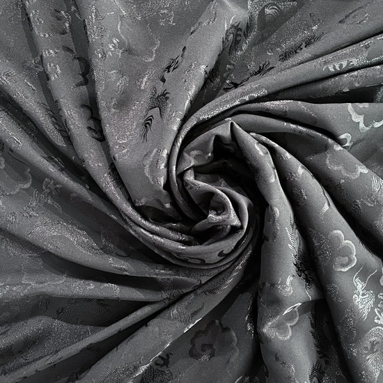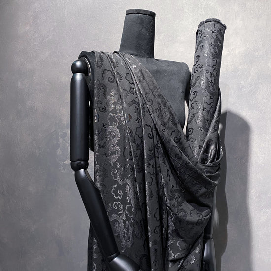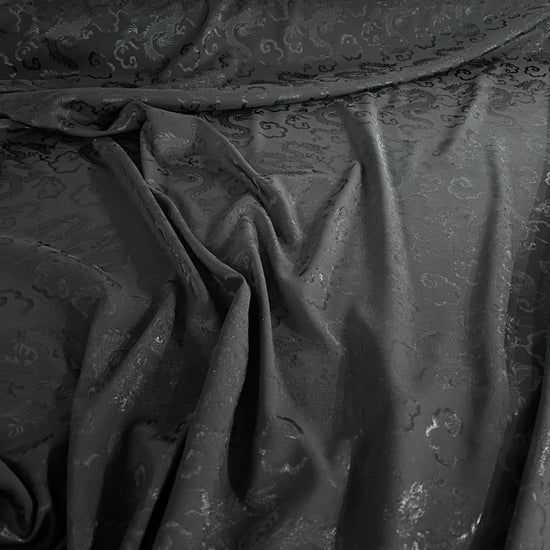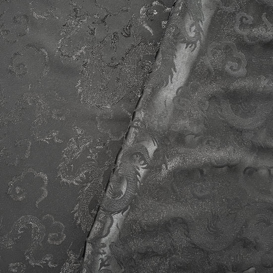 Silk-polyester blend satin jacquard in Black. This medium-to-lightweight fabric has a fine satin jacquard weave, featuring Traditional Chinese dragon motifs, a lustrous sheen, and a smooth handle. It has a fluid drape, opaque coverage, and slightly stretches across the salvage.