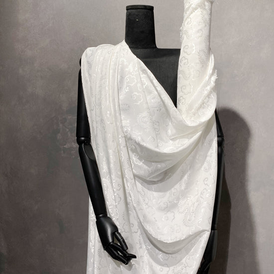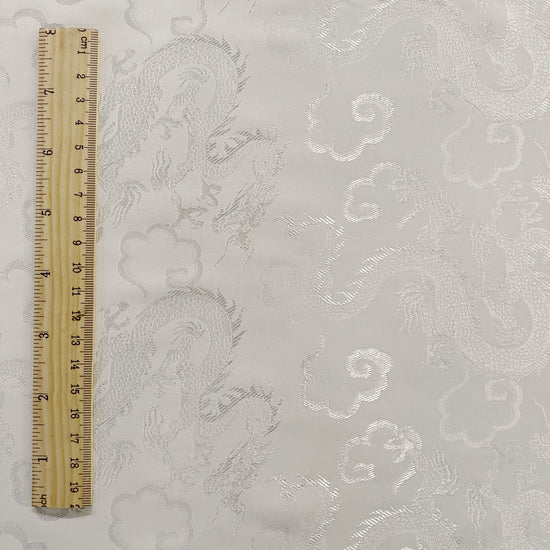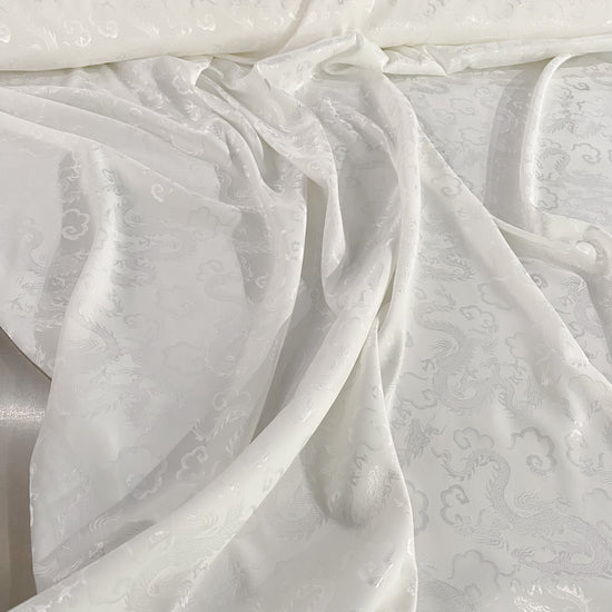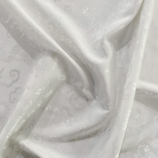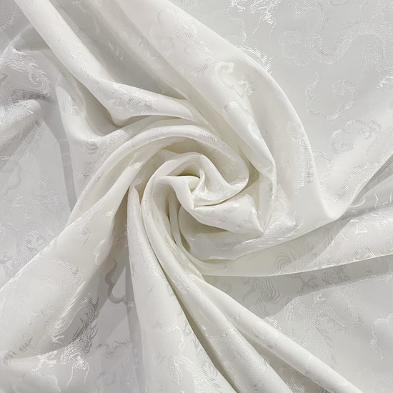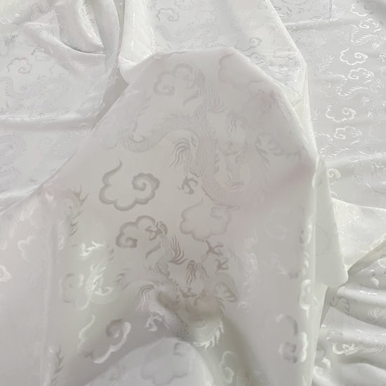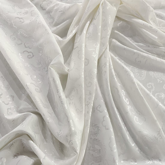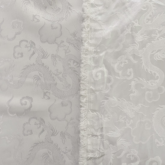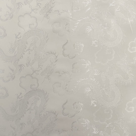 Silk-polyester blend satin jacquard in White/Silver. This medium-to-lightweight fabric has a fine satin jacquard weave, featuring Traditional Chinese dragon motifs, a lustrous sheen and a smooth handle. It has a fluid drape, opaque coverage, and slightly stretches across the salvage.