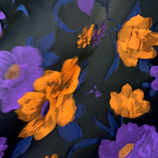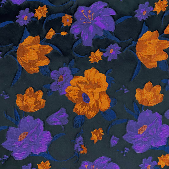 Cotton/Polyester blend satin jacquard in Purple/Orange/Midnight Blue. This heavy weight satin jacquard has a floral motif with raised, rippled handle. It has a structured drape, opaque coverage, and no stretch.