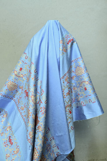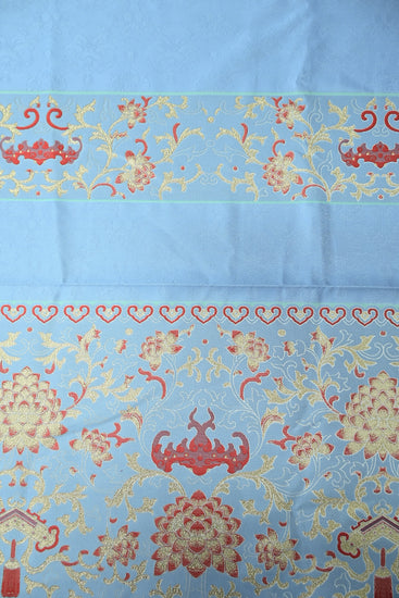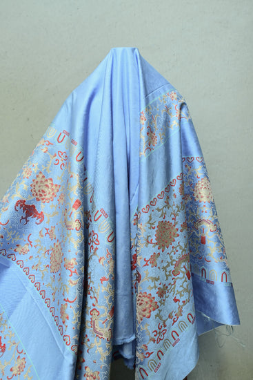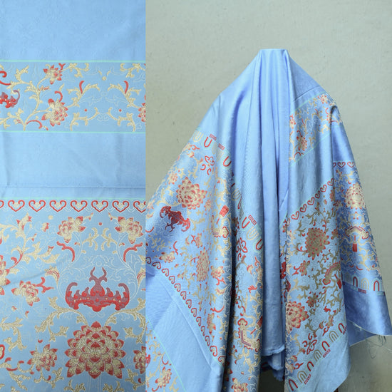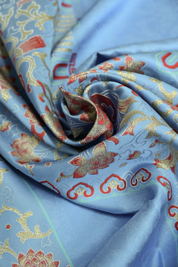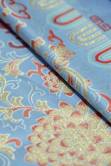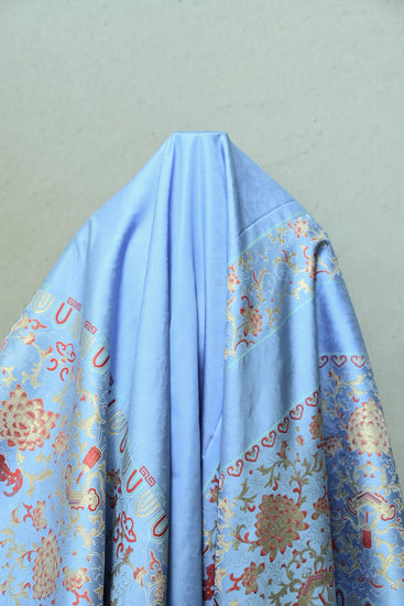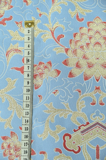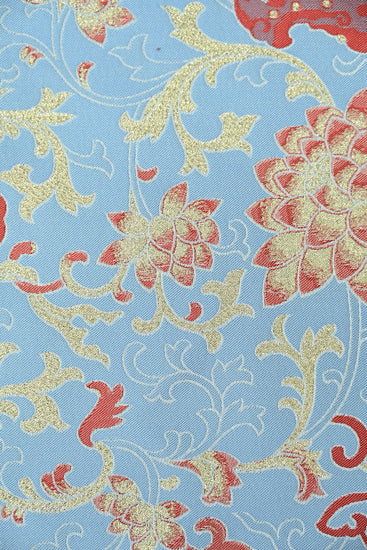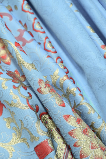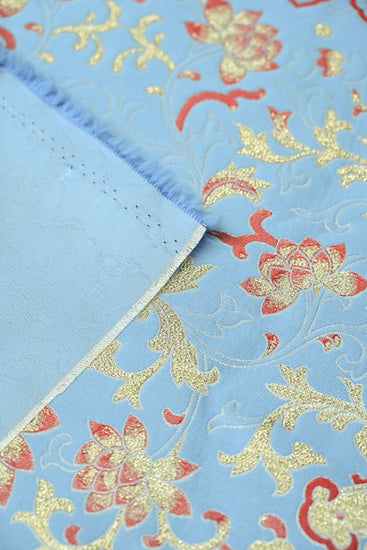 Polyester-blend brocade in Light Steel Blue. This medium weight fabric has a tight brocade weave featuring floral motifs with metallic accents, and a soft handle. It has a semi-structured drape, opaque coverage, and no give.