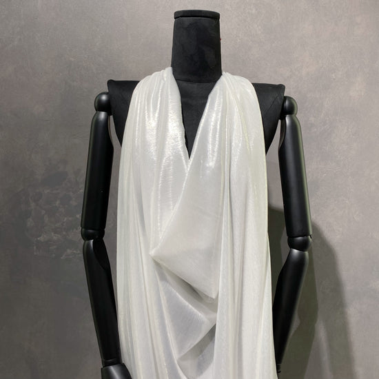 A light weight, opaque brushed metallic velvet with a long-pile, great drape, a very smooth, silky, cool handle, a shiny appearance and very minimal stretch in the weft direction.