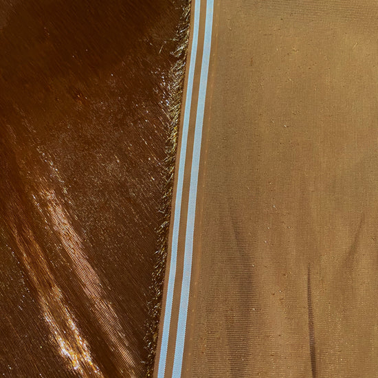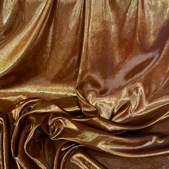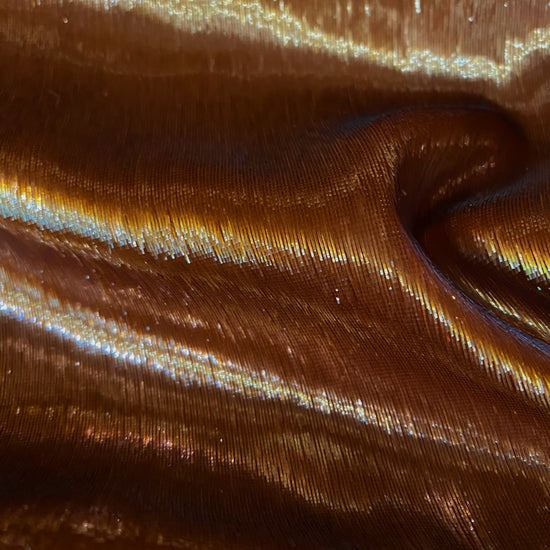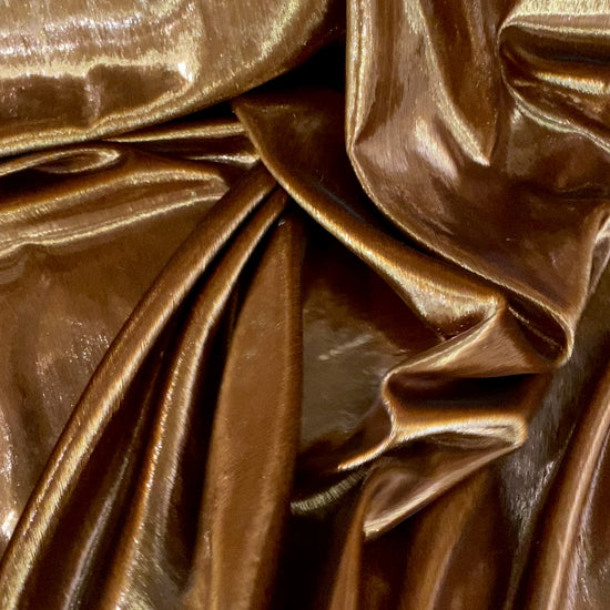 A light weight, opaque brushed metallic velvet with a long-pile, great drape, a very smooth, silky, cool handle, a shiny appearance and very minimal stretch in the weft direction.