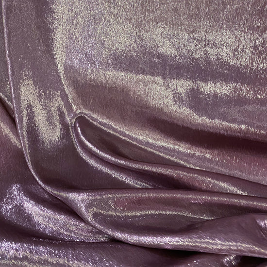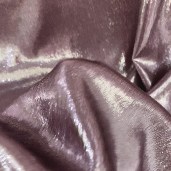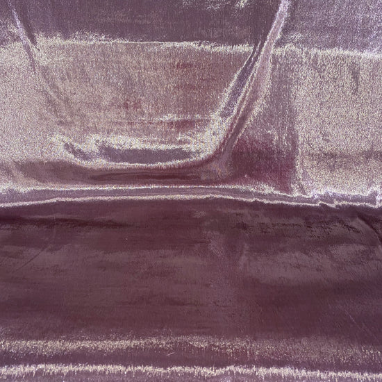 A light weight, opaque brushed metallic velvet with a long-pile, great drape, a very smooth, silky, cool handle, a shiny appearance and very minimal stretch in the weft direction.