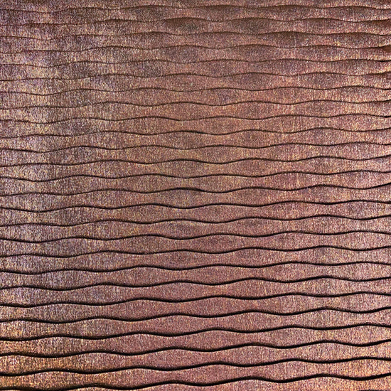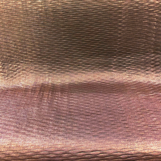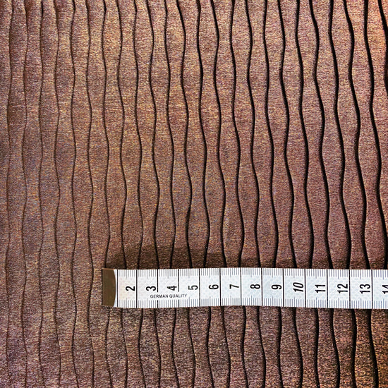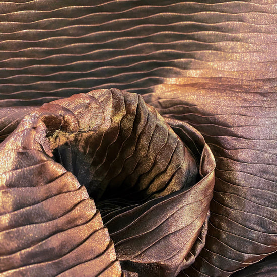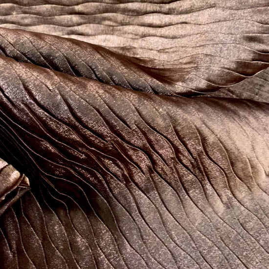 Polyester satin in Bronze. This light weight fabric has been tightly woven in a satin structure, with a smooth handle and a wavy texture. It has a structured bounce, opaque coverage, and a slight warp ease provided by the pleated finish.