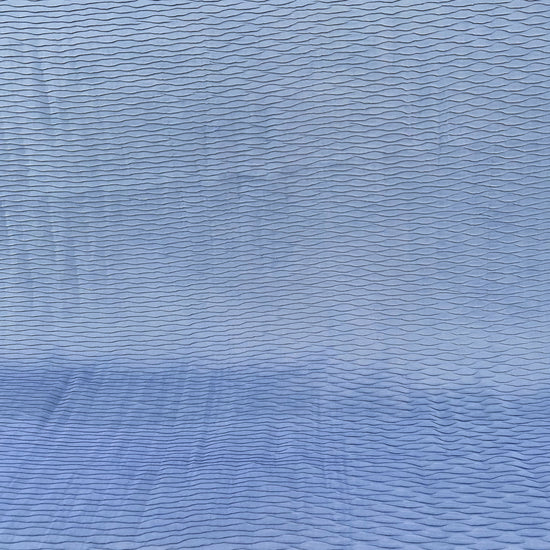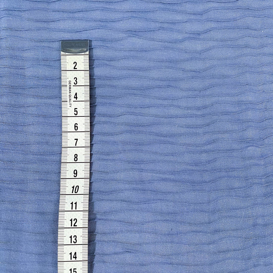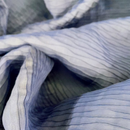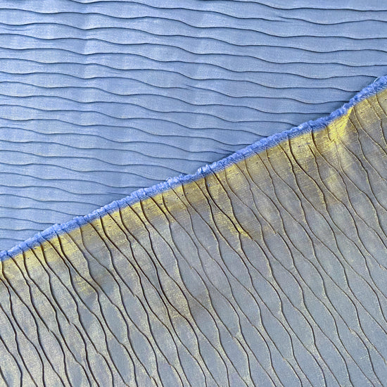 A medium weight, opaque shot twill with wave shaped delicate pleating, textured, crinkled handle, good, structured drape and stretch in both warp and weft directions.