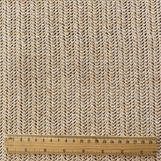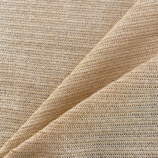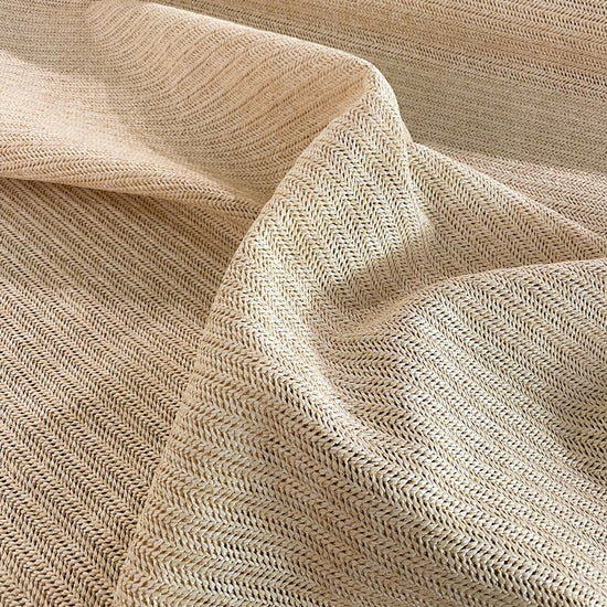 Polyester basket-weave in cream. A heavyweight basket weave, stabilised to a weft-knit backing. It has an organic sheen, structured drape, opaque coverage, and no stretch.
