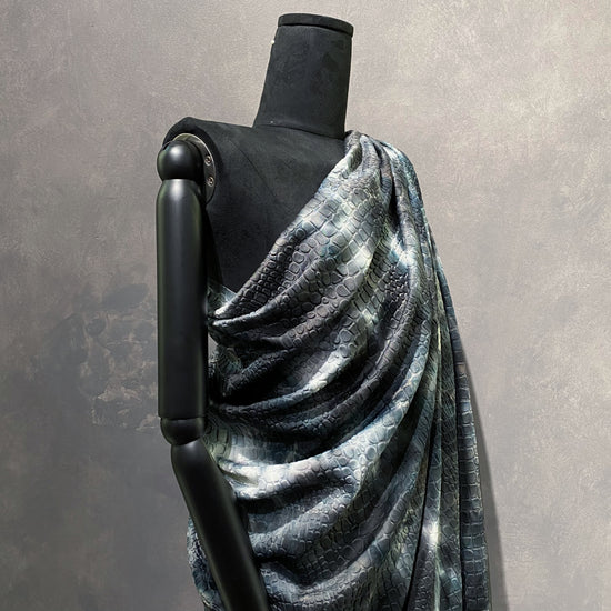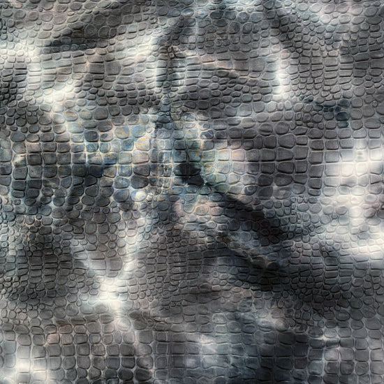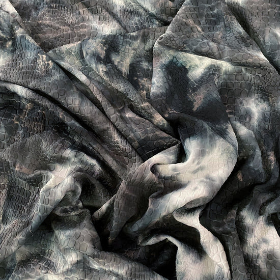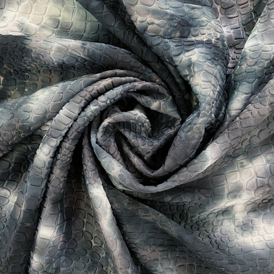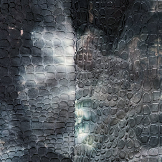 Navy Blue / White variegated tie dye effect on a medium weight double knit embossed with crocodile pattern. Opaque with stretch in both directions, (a little more in the weft direction) good, structured drape and textured handle.