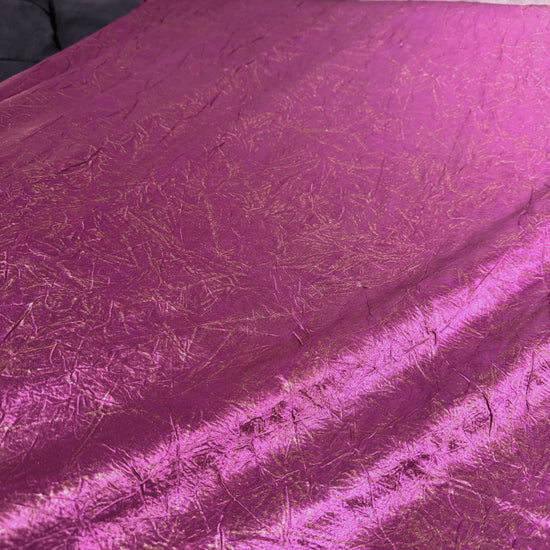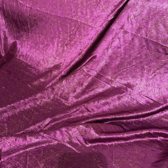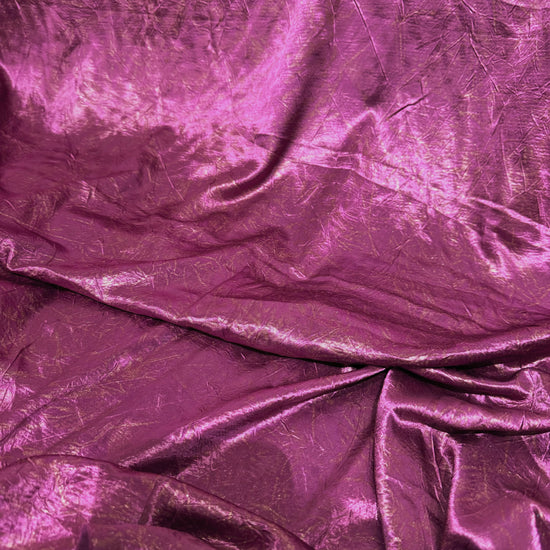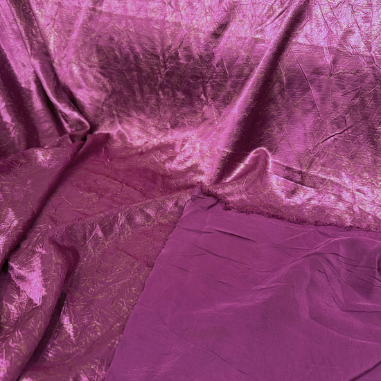 A light weight, opaque, foiled twill with no give. It has a heavy, slinky drape, shiny, crinkled appearance and smooth and textured handle.