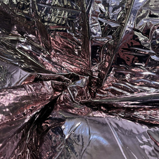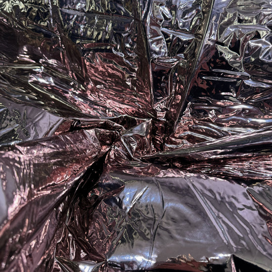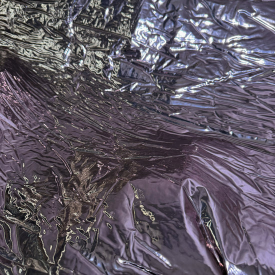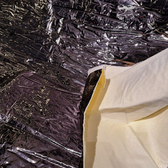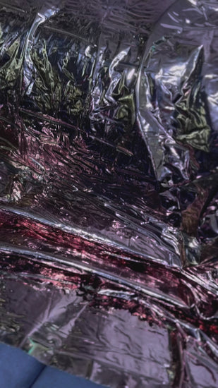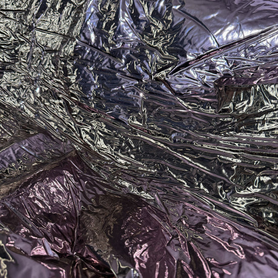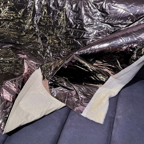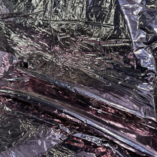 A medium weight, opaque, minimal drape, non-stretch PVC bonded with short pile polar fleece. It has a glossy appearance, and soft, auditory handle