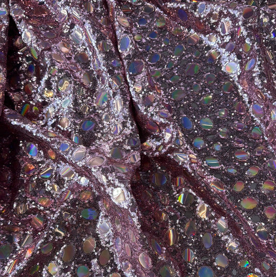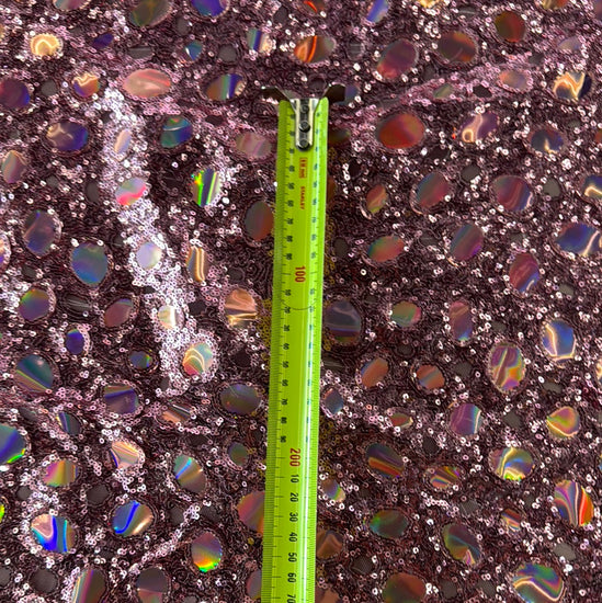 Sequined polyester tulle in Metallic Pink. This lightweight knit has a dense sequined finish with a reflective metallic sheen. It has a structured drape, semi-sheer coverage, and a slight ease across the weft.