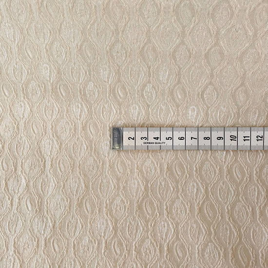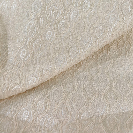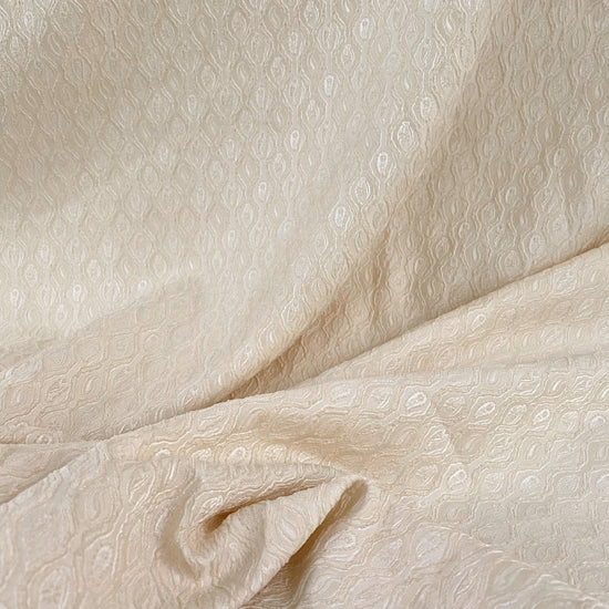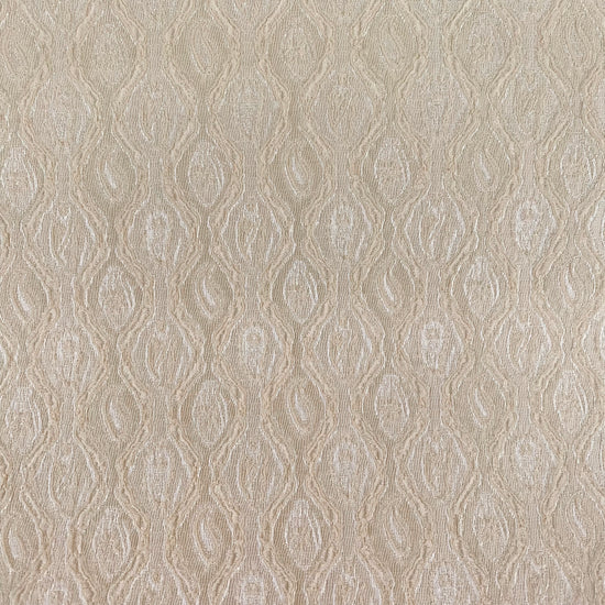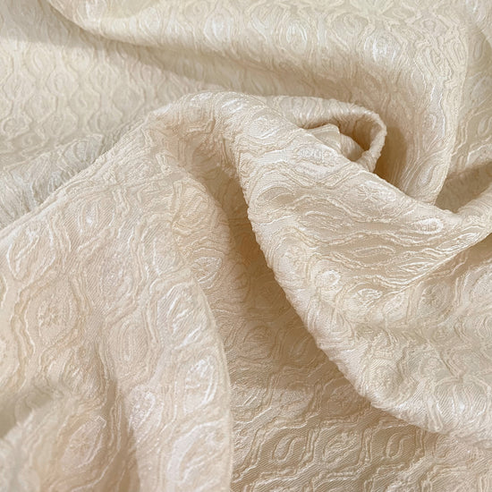 A medium weight, opaque, damask jacquard with geometric paisley-like motif. This fabric has a structured drape and a raised handle.