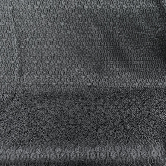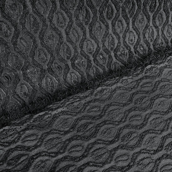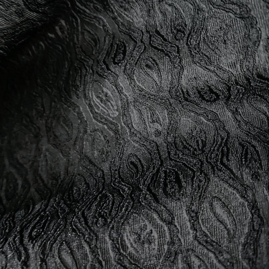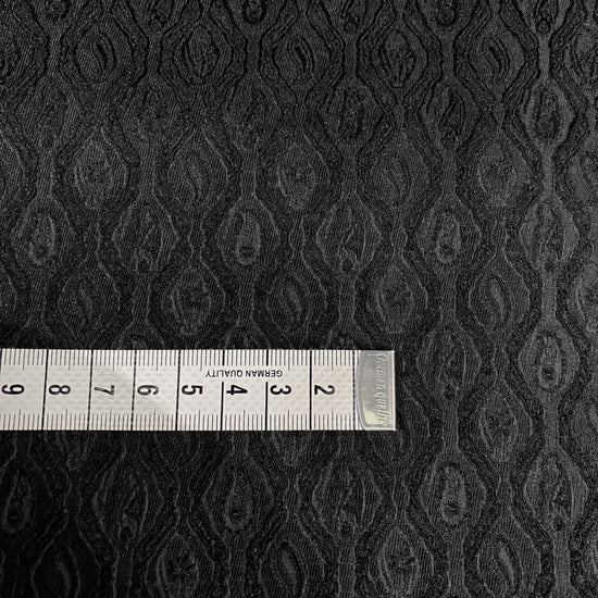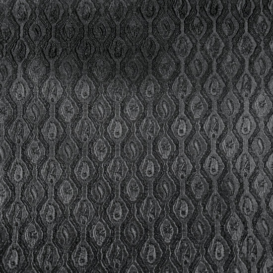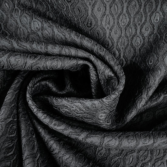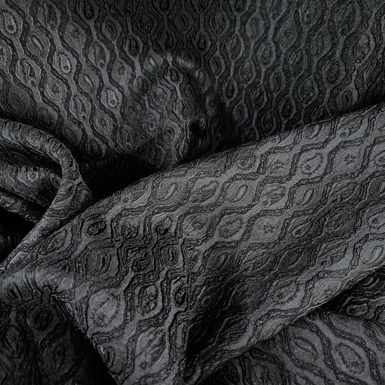 A medium weight, opaque, damask jacquard with geometric paisley-like motifs, a good, structured drape and a textured handle.