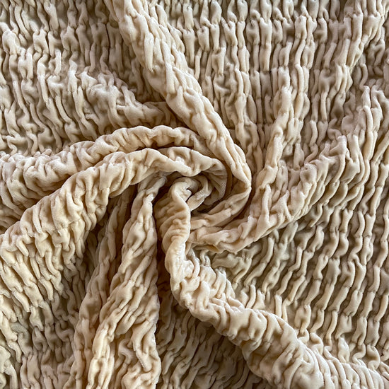 Soft and silky luxurious velvet, heavier weight and a 4-way stretch, with further stretch due to the circular shirring giving the fabric a unique smocked look.