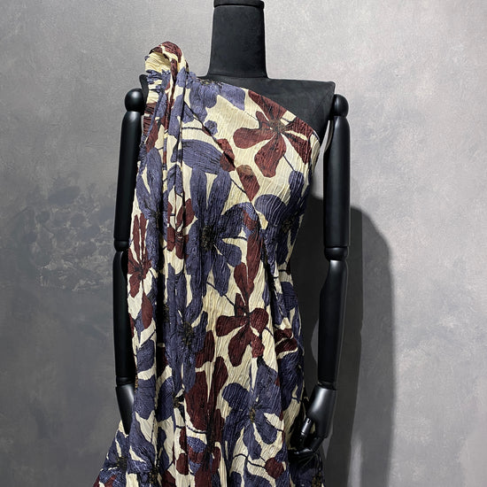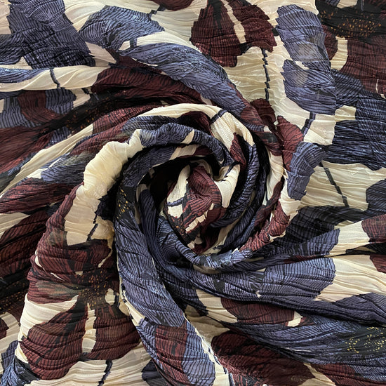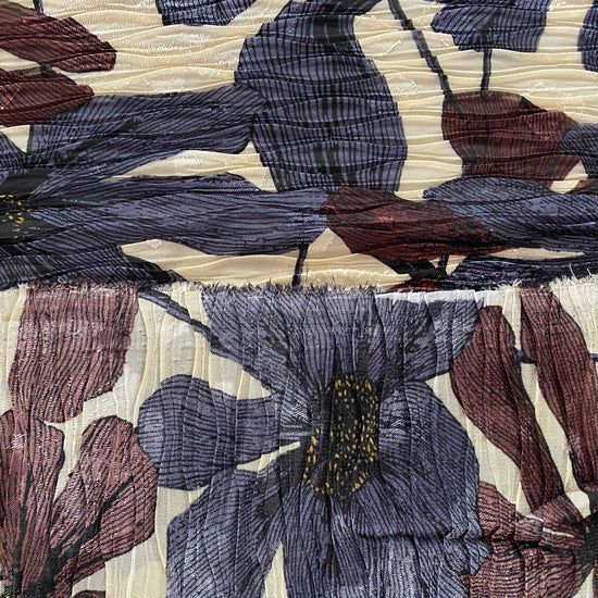 A polyester voile woven in a dobby structure with abstract satin-woven motifs, printed with floral design featuring large clematis flowers, then manipulated into wavy knife pleats. Medium weight with a bouncy, lightly voluminous drape, holding some slight structure with the pleats, semi-transparent with a slightly dry handle, mostly matte appearance, some give in the warp direction due to the pleating (expanding the pleats too far will distort the fabric), and no give in the weft direction.