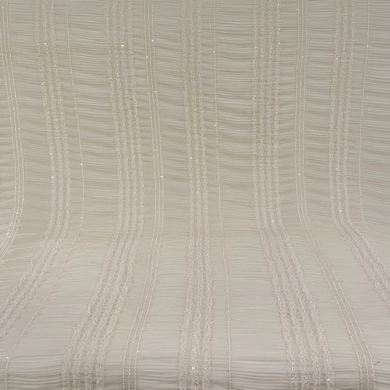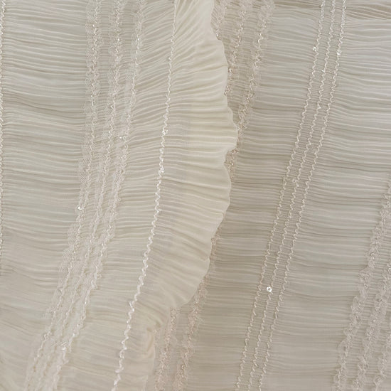Polyester chiffon in ivory. This lightweight chiffon has a fine pleated finish, stabilised with ruffled trims along the salvage. It has a soft drape, semi-sheer coverage, and slight stretch along the salvage.