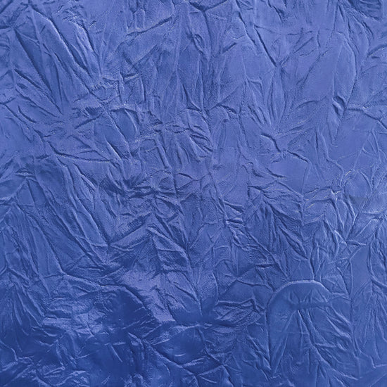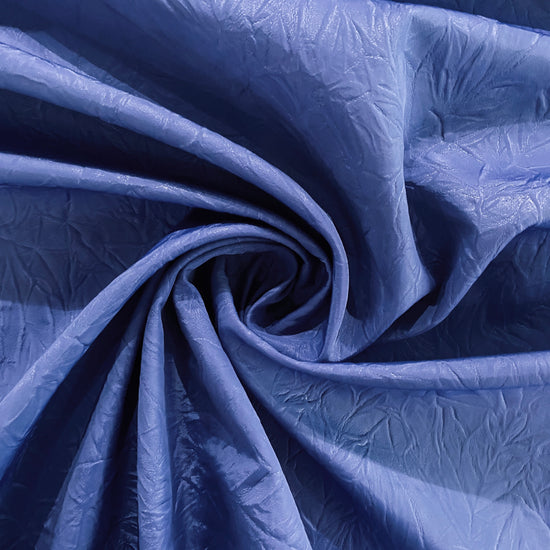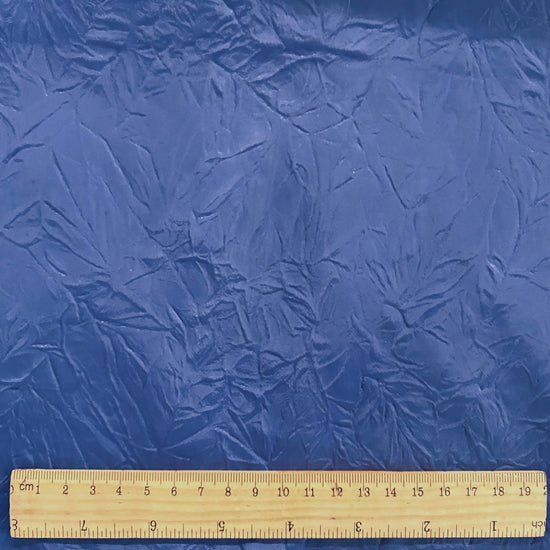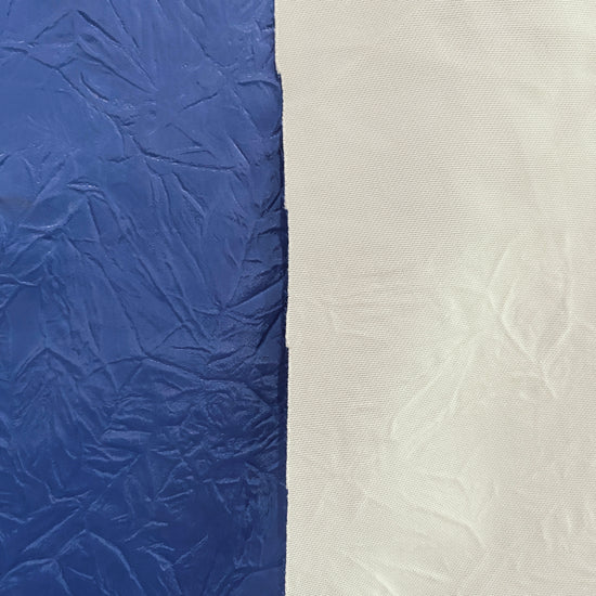 A tightly woven blue polyester taffeta laminated to a heavy white polyester single-knit. The taffeta surface has been heat manipulated to have a wrinkled, creased texture. Perfect for bomber jackets, a modern take on a French chore, or structured bags, skirts and dresses. Heavyweight with a voluminous drape, opaque coverage and no give in either direction.
