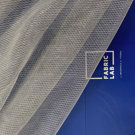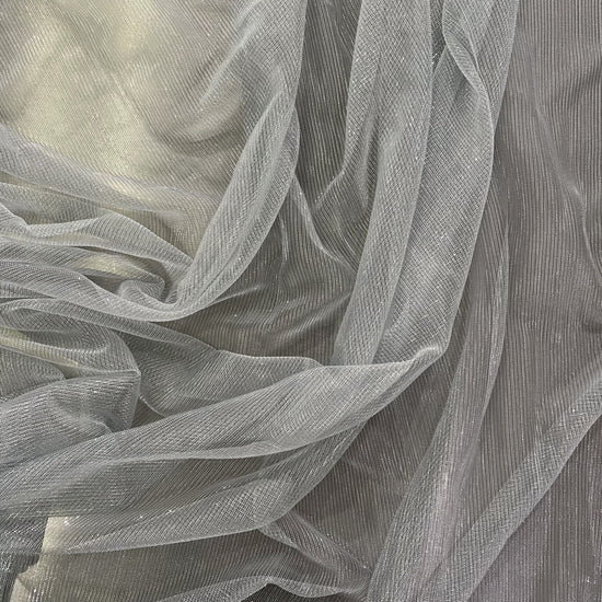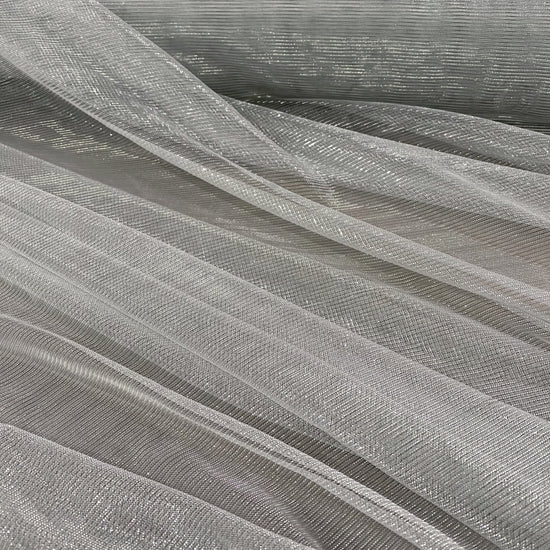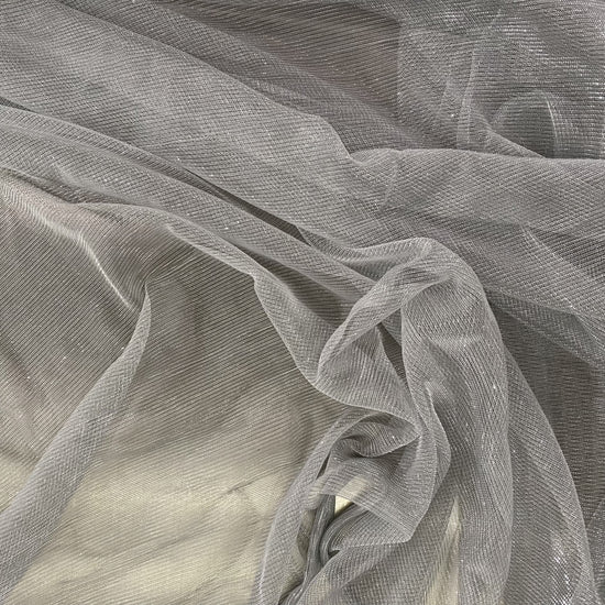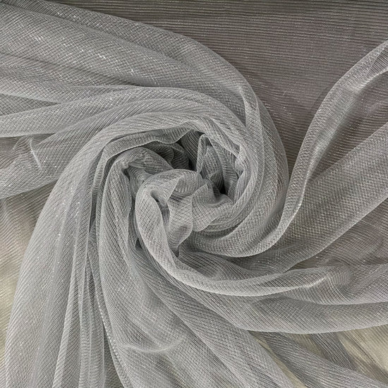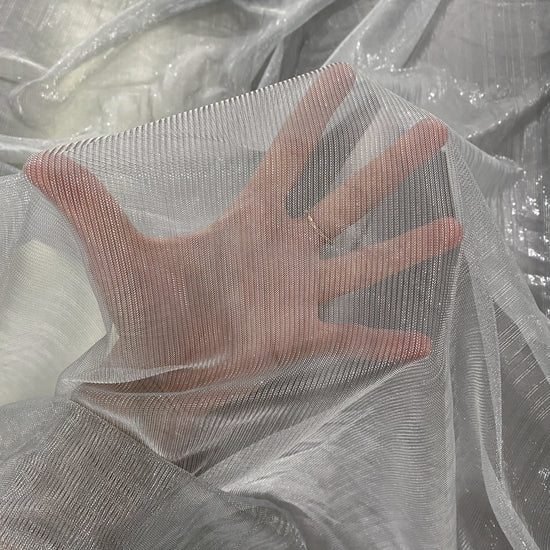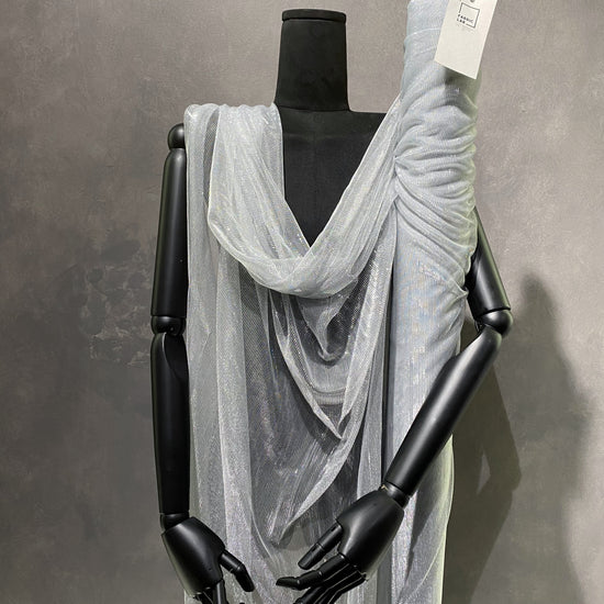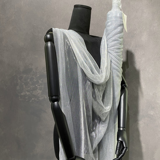 Polyester raschel knit in Silver. This light weight fabric has a loose raschel structure, with a ribbed handle and metallic sheen. It has a fluid drape, sheer coverage, and stretches across the salvage.