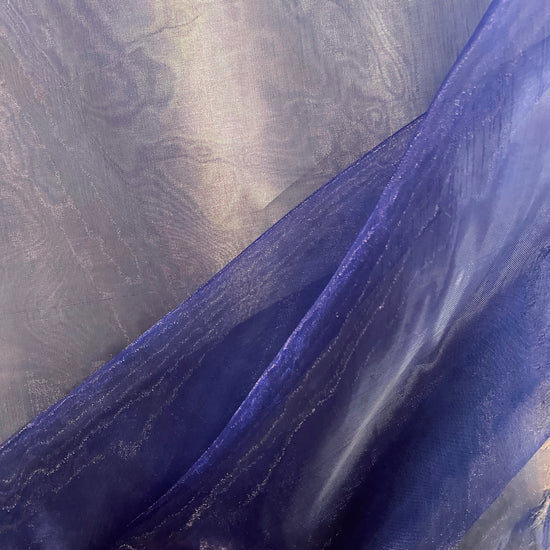 Polyester organza in Navy. This lightweight fabric has a fine weave with a grainy metallic lustre, and a smooth handle. It has an airy, bouncy drape, semi-sheer coverage, and no stretch.