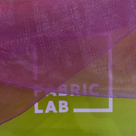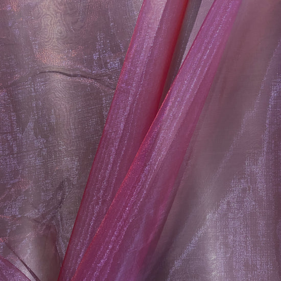 Polyester shot organza in Orchid/Crimson. This lightweight fabric has a fine plain weave with a shot dichromatic lustre, and a dry handle. It has an airy, structured drape, semi-sheer coverage, and no stretch.