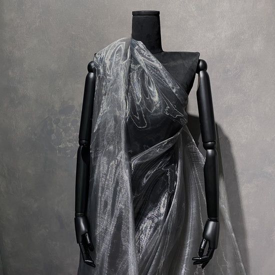 Polyester organza in Silver. This lightweight fabric has a fine plain weave with a grainy metallic lustre and a dry handle. It has a structured drape, semi-sheer coverage, and no stretch.