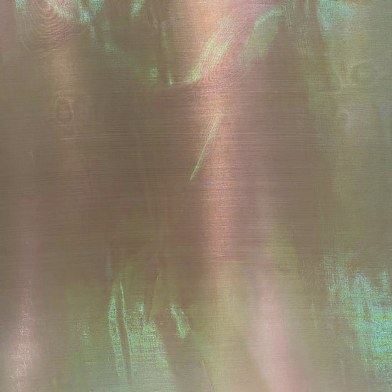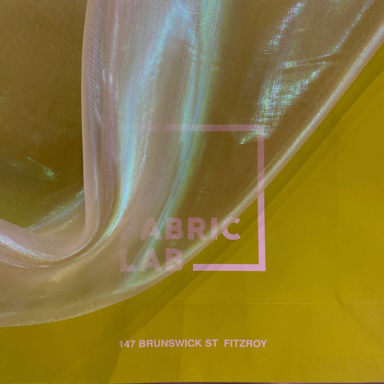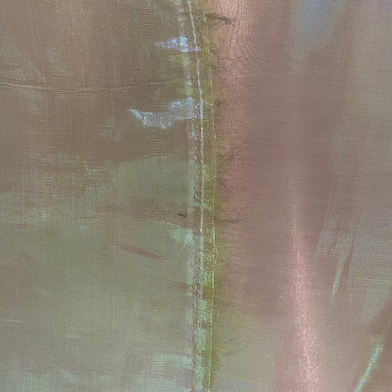 Polyester organza in Pale Green/Holographic. This lightweight fabric has a fine plain weave with a dichromatic holographic lustre, and a dry handle. It has a structured drape, semi-sheer coverage, and no stretch.