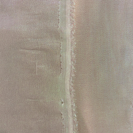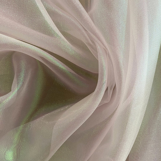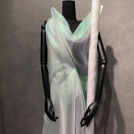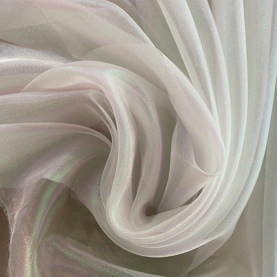 Polyester organza in Holographic White. This lightweight fabric has a fine plain weave with a grainy metallic lustre, and a dry handle. It has a structured drape, semi-sheer coverage, and no stretch.