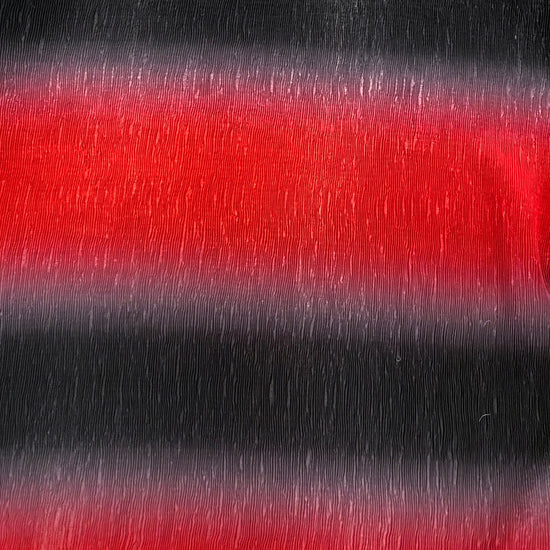 A polyester organza with a satin face, digitally printed with a red and black gradient ombre stripe running the the warp direction, with a heat-set pleating manipulation to the organza. Medium weight with a voluminous, bouncy drape and very structured in the direction of the pleats (weft), semi-transparent with a corrugated handle, a muted lustre, with plenty of give in the warp direction due to the pleating and no give in the weft direction.