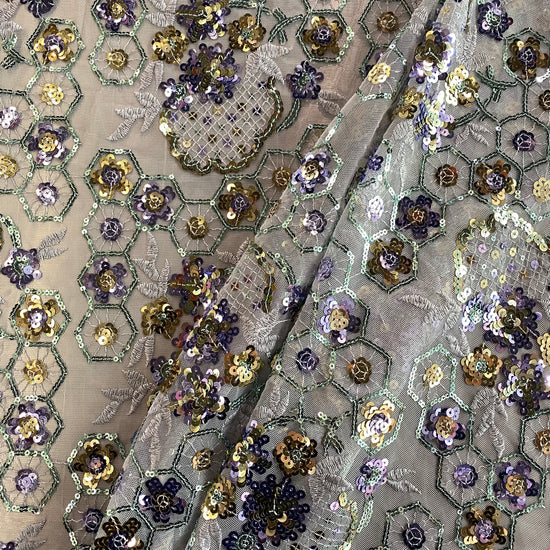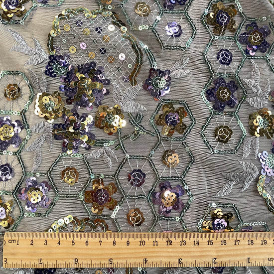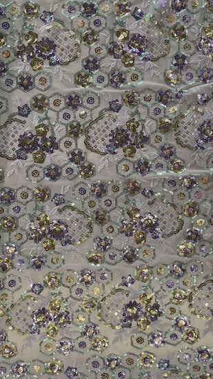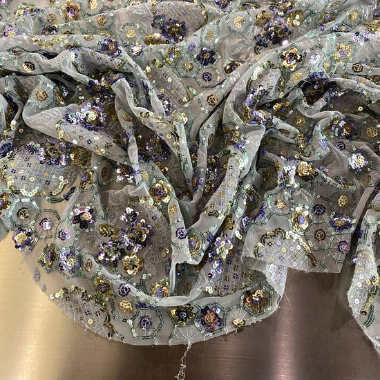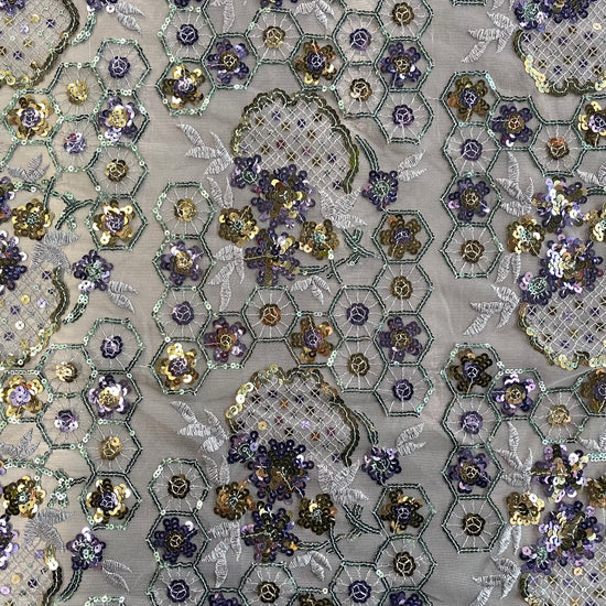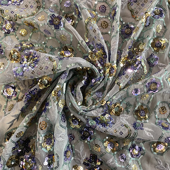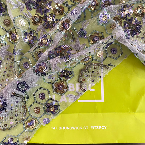 Polyester tulle in Lavender/Pale Green/Gold. This lightweight tulle has a fine mesh, embellished with sequined floral and geometric motifs. It has an airy drape with a slight structure to it, semi-sheer coverage, and elongates across the salvage.