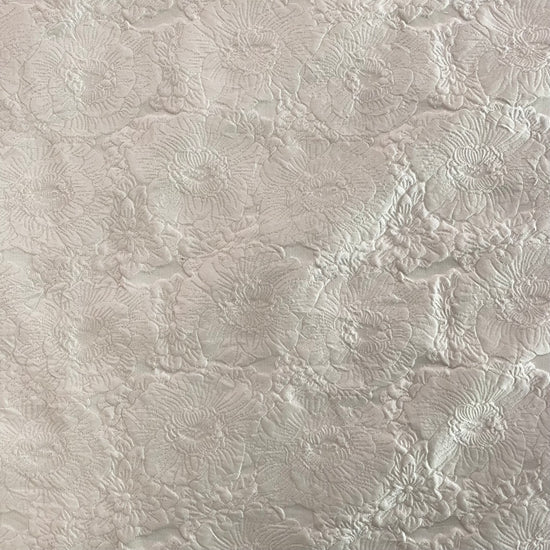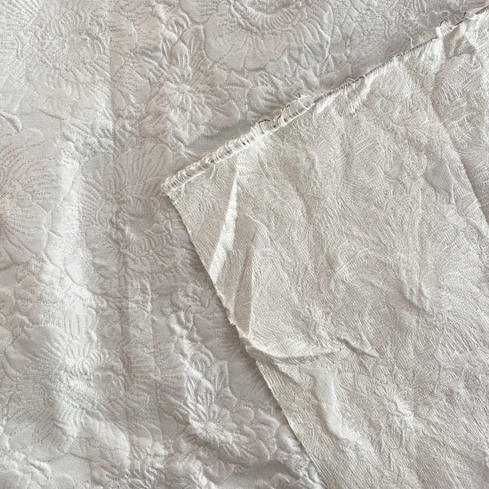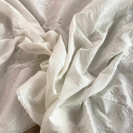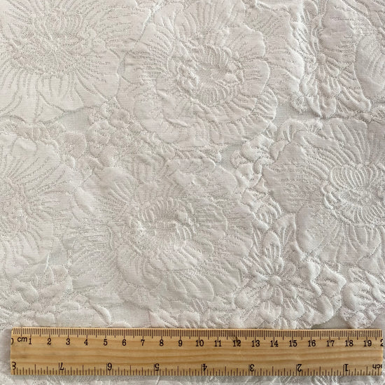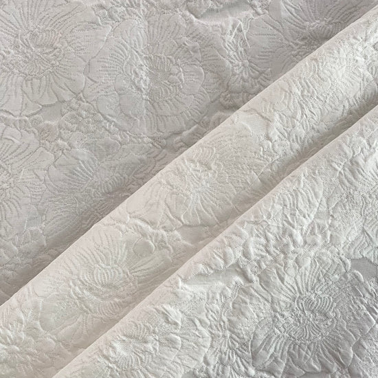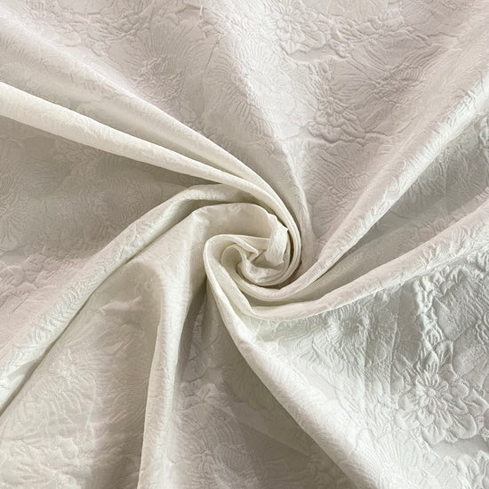 Polyester jacquard in white. This medium weight jacquard has a large repeat floral motif with a raised handle, and a subtle sheen. It has a structured drape, opaque coverage, and no stretch.