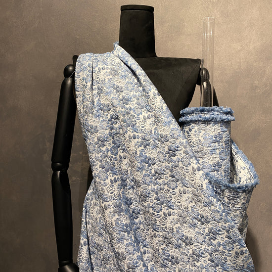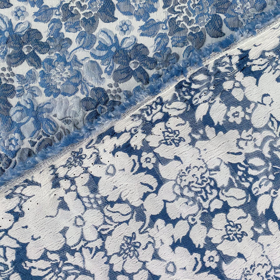A medium weight, opaque jacquard with delicate blue flowers, a soft, light upholstery handle, good structured drape and some stretch in the weft direction.